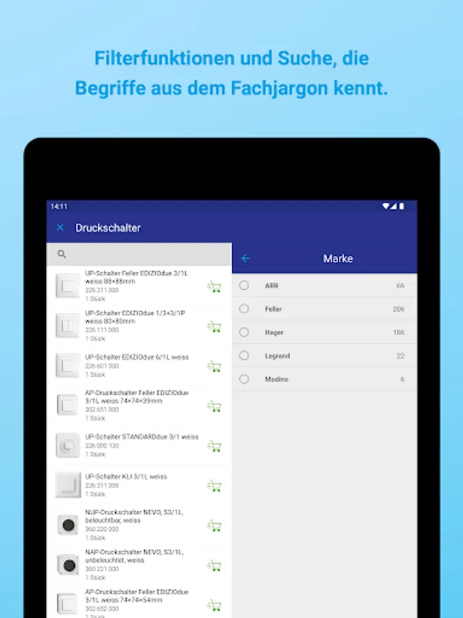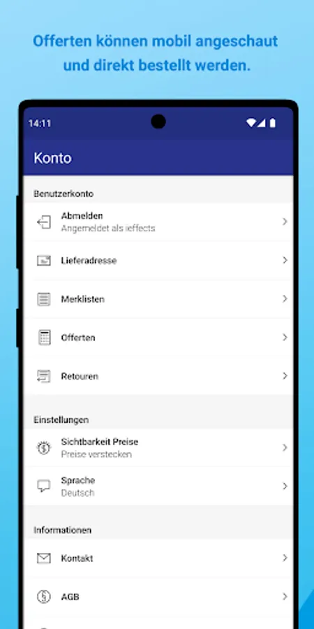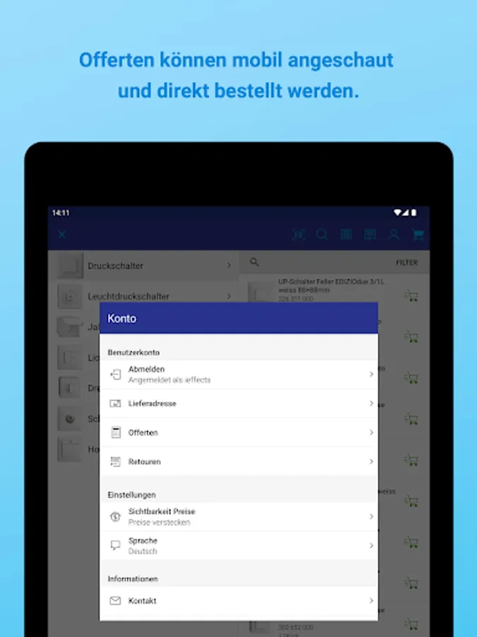 Thanks to dynamic caching, the product data is preloaded into the app. This means that the app works smoothly even in places with poor mobile network coverage. For example, in a basement or on a remote construction site, you can put the items you want in your shopping cart and send the order as soon as you have reception again.