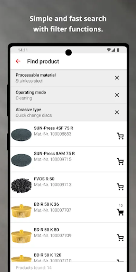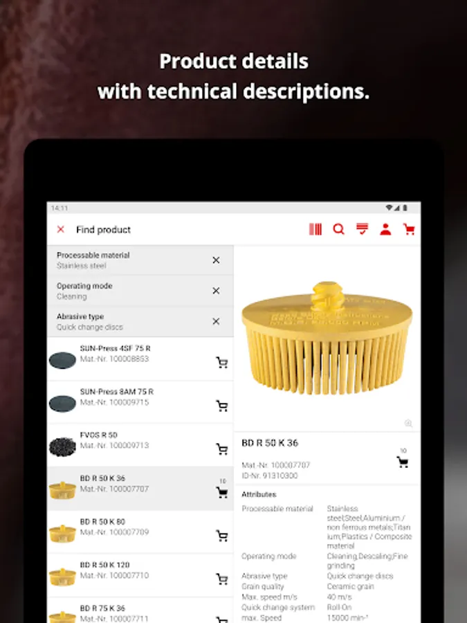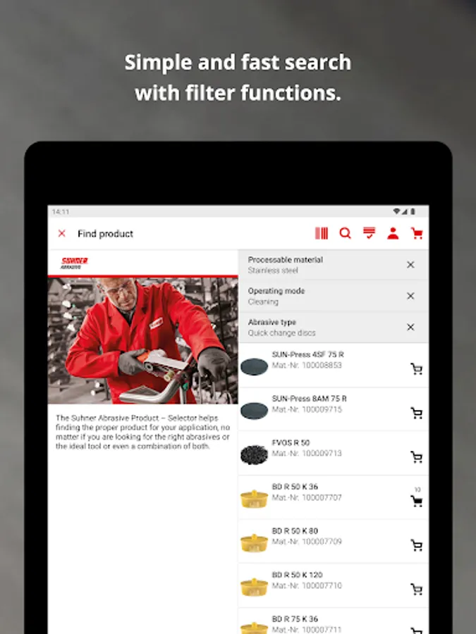 The SUHNER app is the ideal, digital solution for metalworking professionals and companies. Find the right grinding machines and abrasives quickly and efficiently.