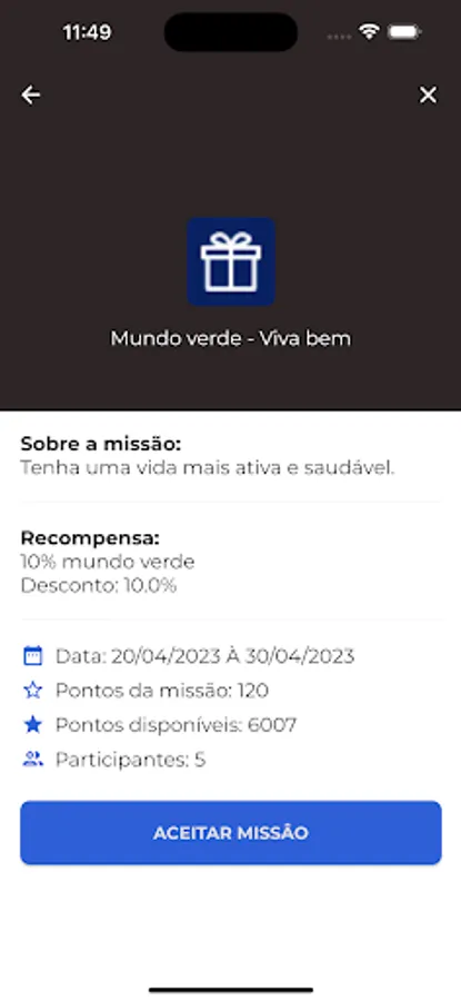 The missions have an amount of points to be achieved, when you have enough amount it is possible, "Buy the mission", you will use your points in the mission you want, as soon as the mission is completed it will be possible to acquire your prize, in this case a coupon of discount for the purchase of an item from registered stores.