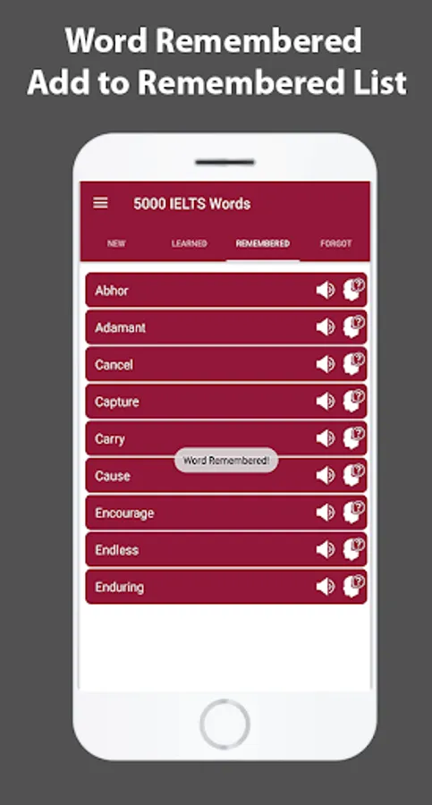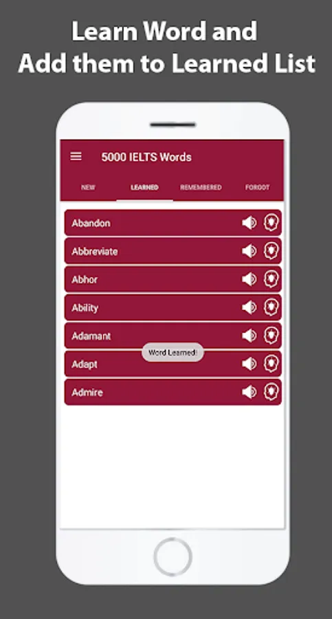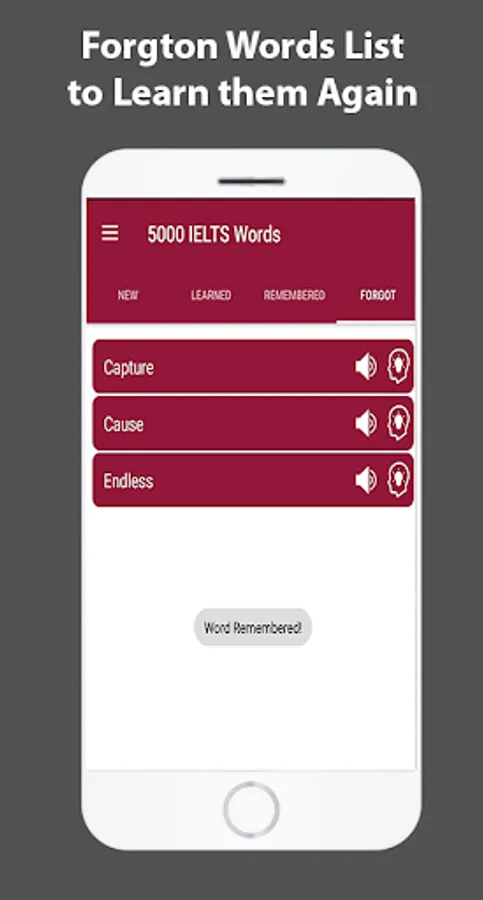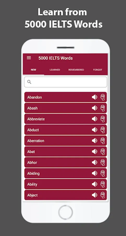 We have designed this app while keeping in view the basic needs of the English students. Categorized in 4 different parts i.e. New words, Learned Words, Remembered words and Forgotten words. These categories will help you learn all of the 5000 essential words of IELTS in just few days of practice.