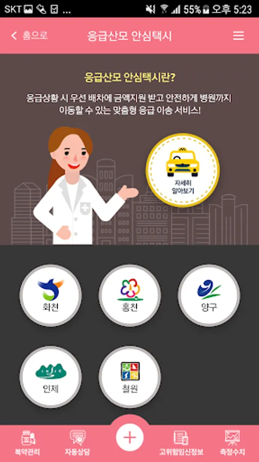★ 응급산모 안심택시 메뉴 추가 - 응급상황 시 고위험 산모의 안전한 이동을 위해 협약된 택시 회사에 전화하여 신속하게 콜택시를 이용하실 수 있습니다.