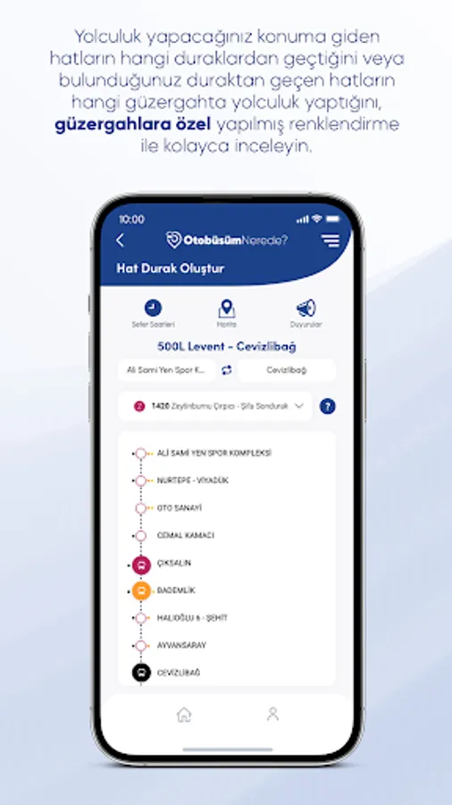 You can examine the main and depar routes of the bus lines by searching by line name. By selecting the route you want to see from the line detail page, you can see which stops are on that route. You can monitor the instant locations of the buses, and you can easily distinguish which bus from which route the bus passes through with special coloring for depar routes. If you wish, you can also view all the routes of the line on the map by switching to the map view. For this, it is enough to activate the routes you want to see with the filter icon in the upper left corner of the map.