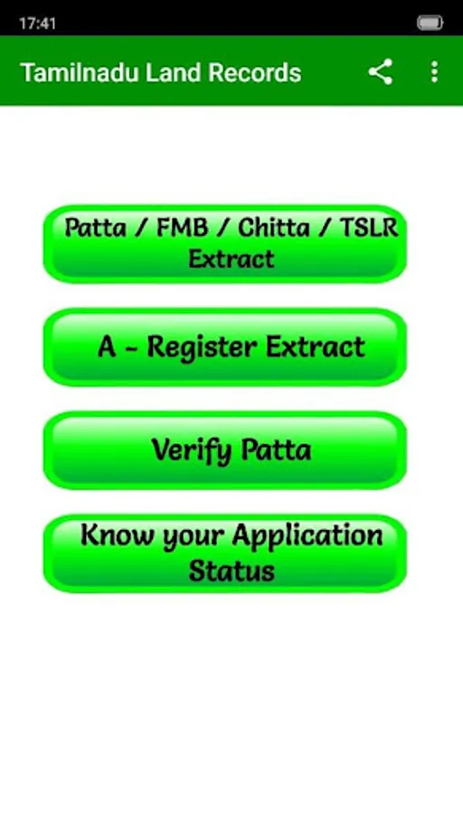Tamilnadu Land Records Application Contains.....Paata, FMB, Chitta, TSLR Extant, Verify Patta and Know your Application Status etc......