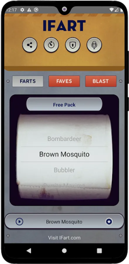 You get 35 Fart Sounds including favorites like Dirty Raoul, Wipe Out and The Brown Mosquito, plus features like Sneak Attack, Security Fart and Blast (which plays a random fart)