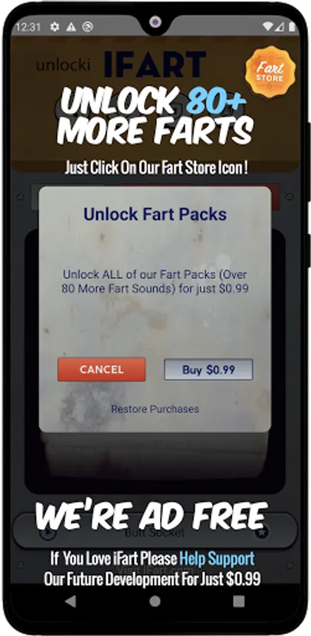 Click the Store icon anytime (or our random popup) to UNLOCK our fart packs like Fart Wars, Jurassic Farts, Funny Foods, Celebrity Names, Gassy Movies and Top Ten Shart Toppers. (Popup will disappear after purchase restart)