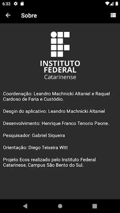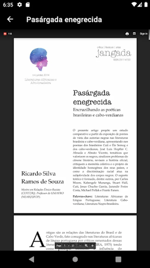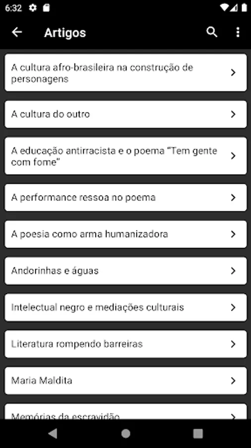 The application, developed at the Instituto Federal Catarinense, seeks to bring visibility to authors who have suffered and are suffering a process of silencing through the dissemination of scientific works whose themes are their works. So far, it is possible to view the articles pertaining to the following authors: Conceição Evaristo, Éle Semog, Ricardo Aleixo and Solano Trindade. New Authors will be added according to the development of projects that support the application.