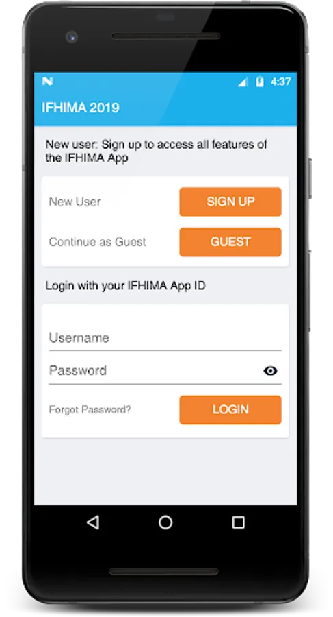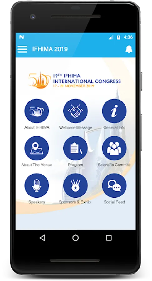 The Visitor Mobile Application for IFHIMA 2019 will showcase the Event information, Program agenda, Speakers, Sponsors and Partners. Visitors would be able to sign-up and set their Personal Agenda and Favorite Speakers, Sessions and interact via social media.