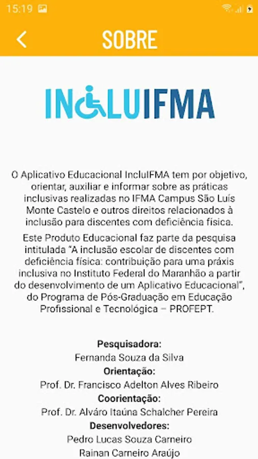 The IncluIFMA Educational Application aims to guide, assist and inform about inclusive practices held at the IFMA Campus São Luís Monte Castelo and other rights related to inclusion for students with physical disabilities.