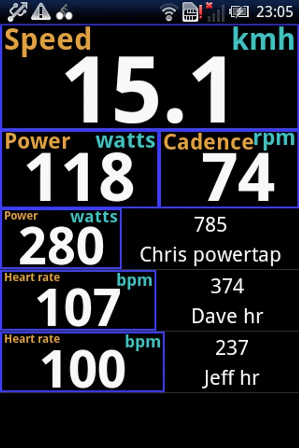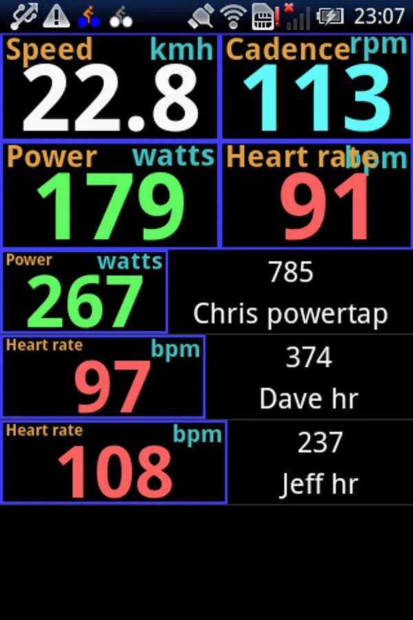 IpPeloton allows you to view your riding companions Heart rate and Power data from ANT+™ sensors. Your main ANT+ sensor data for your own Speed, Cadence, Heart Rate and Power is displayed at the top of the screen where available. Underneath this there is a list of the data from other ANT+ Heart rate and Power sensors in range.