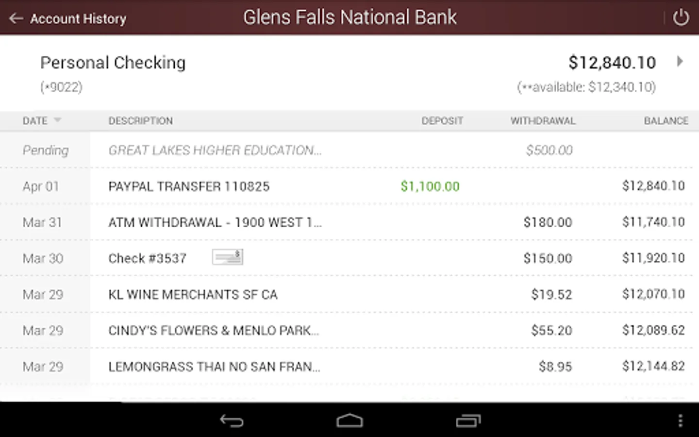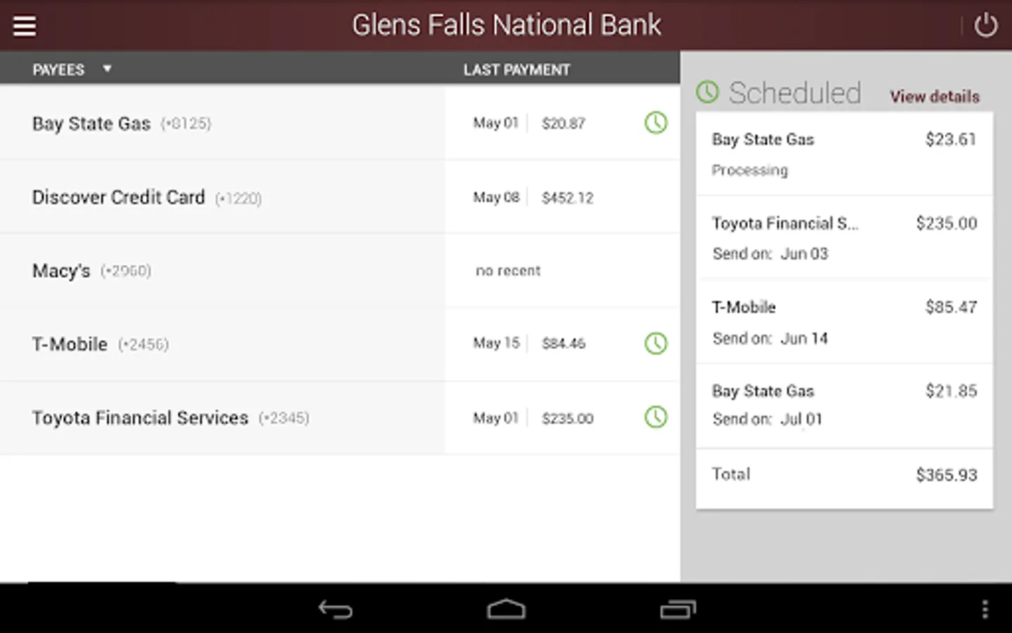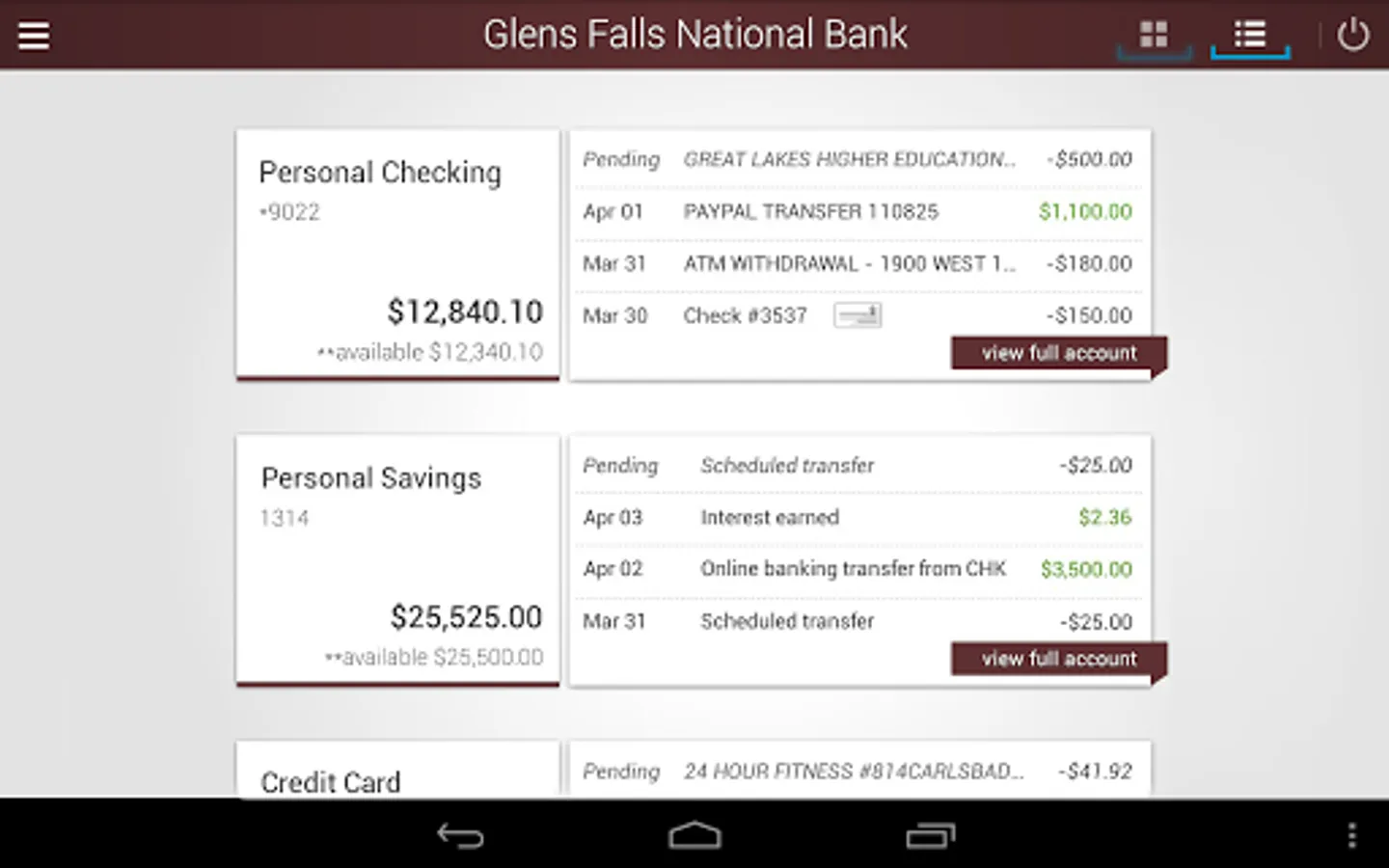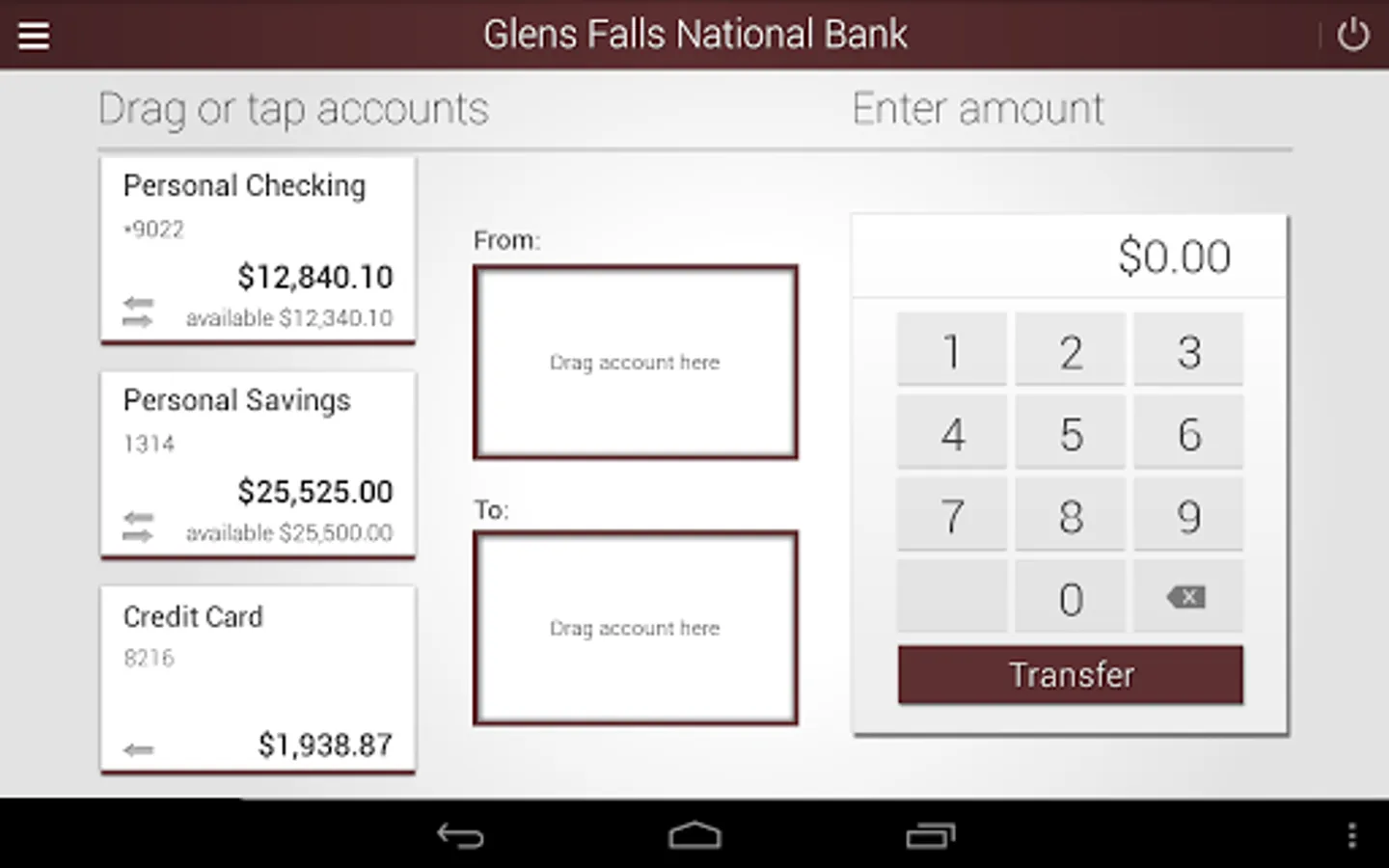 Bank anywhere, anytime with the mobile banking app from Glens Falls National Bank. It's easy, it's secure, and it's Free! Just download the app to your Android smartphone or tablet, and in no time you'll be able to manage your money on the go with the following features:
