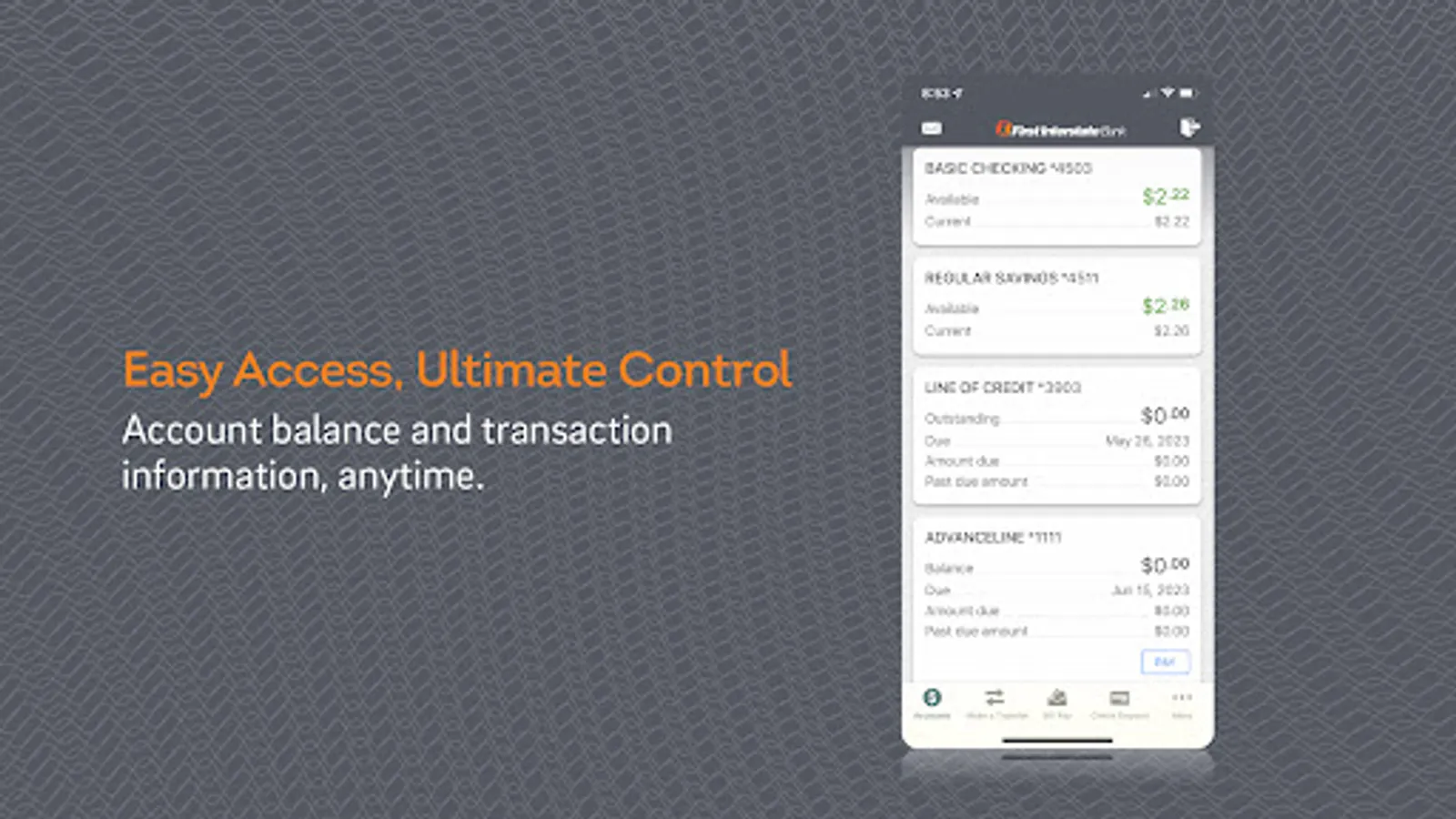 Our First Interstate mobile app lets you securely manage your accounts from anywhere. View balances and transactions, make transfers, deposit checks, receive alerts, and more. Access to the app and its services requires a First Interstate Bank banking relationship. Contact First Interstate Bank for additional information. Available on WearOS