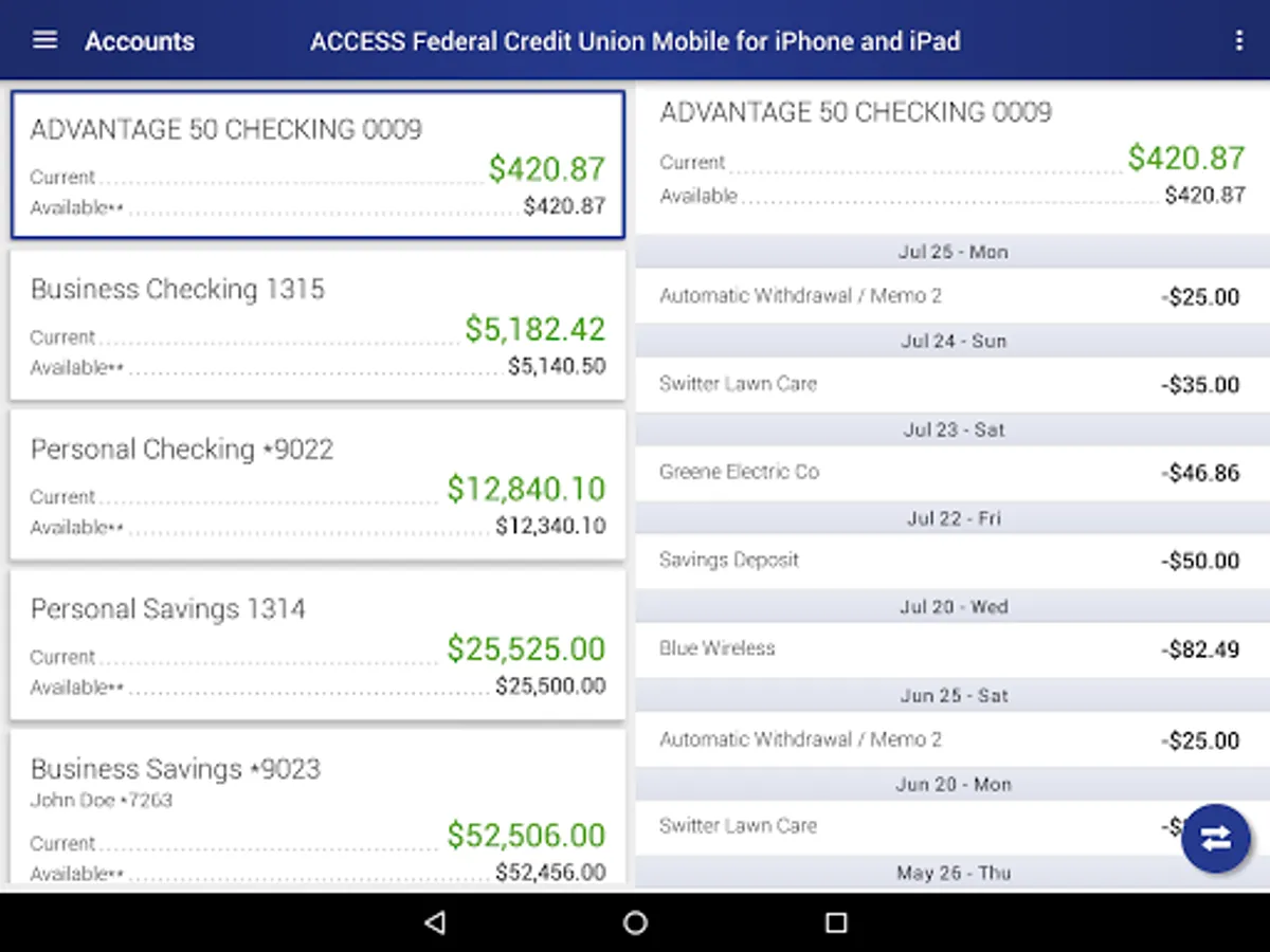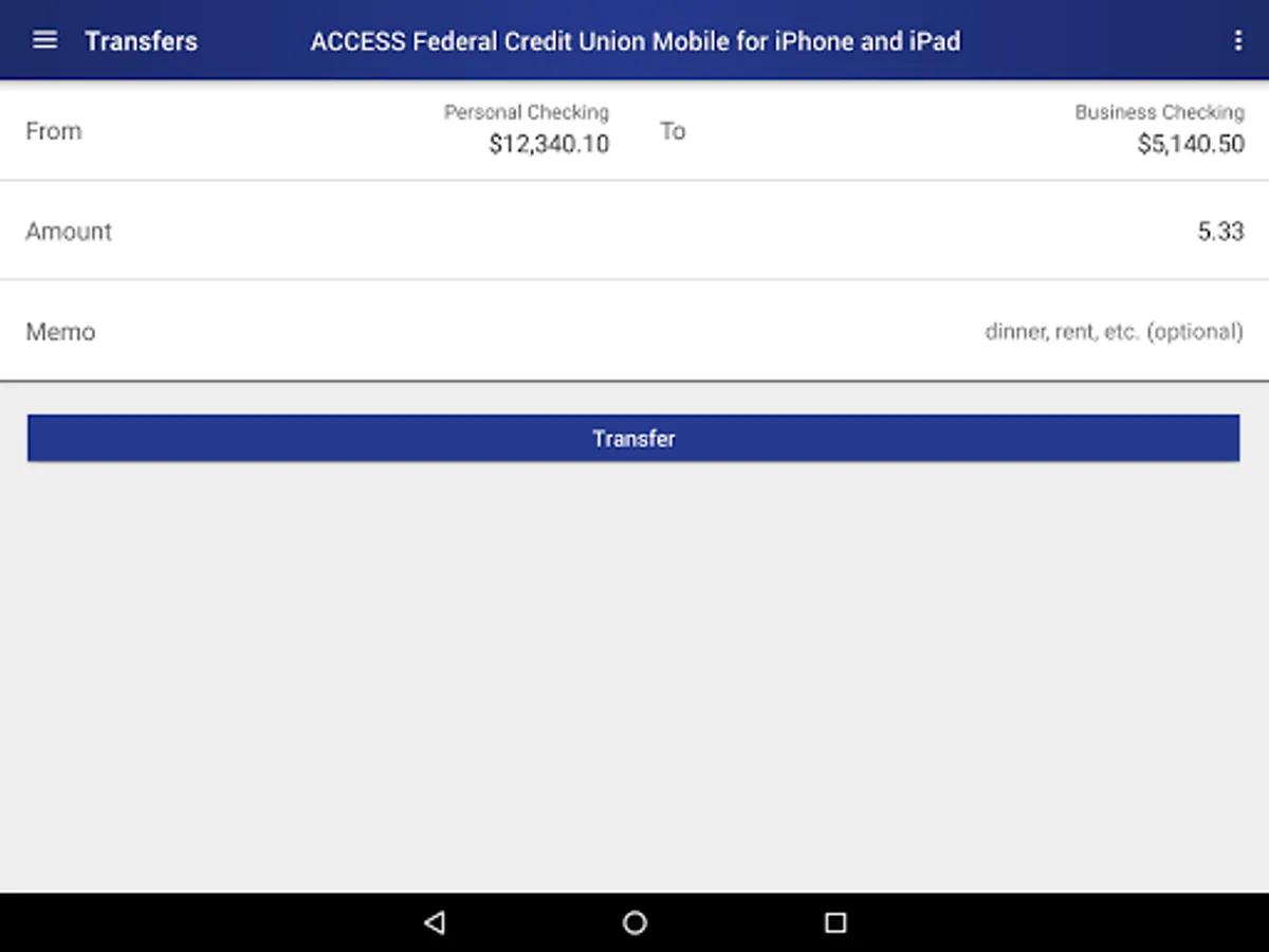 Start banking wherever you are with Access Federal Credit Union Mobile Banking for Android! Available to all AFCU online banking customers, Access FCU Mobile Banking allows you to check balances, make transfers, pay bills, find locations and more.