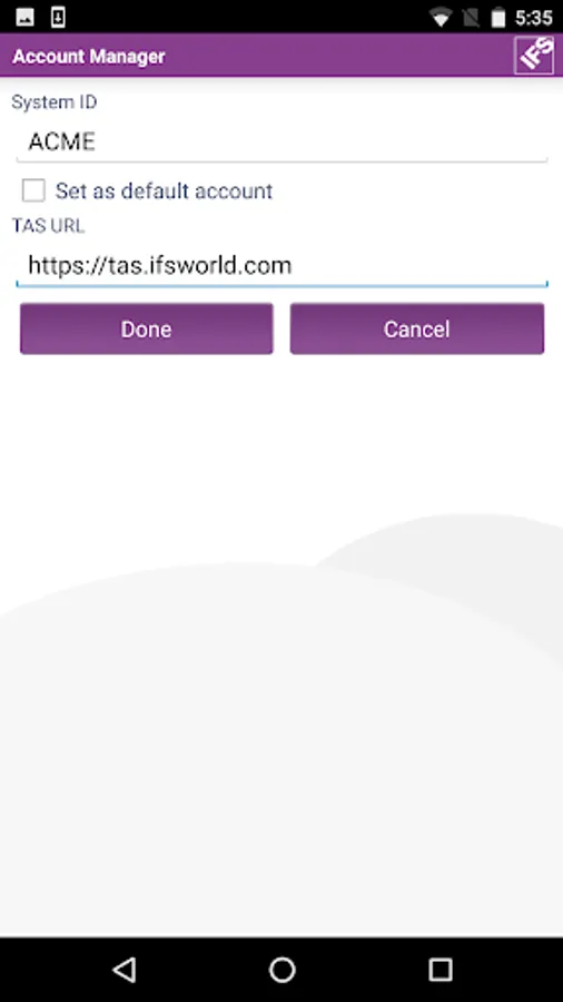 The credentials specified in IFS Account Manager 10 are used by the other Android apps from IFS so that you only need to specify your system id, user name and password once, even if you use multiple apps that connect to the same IFS Applications system.