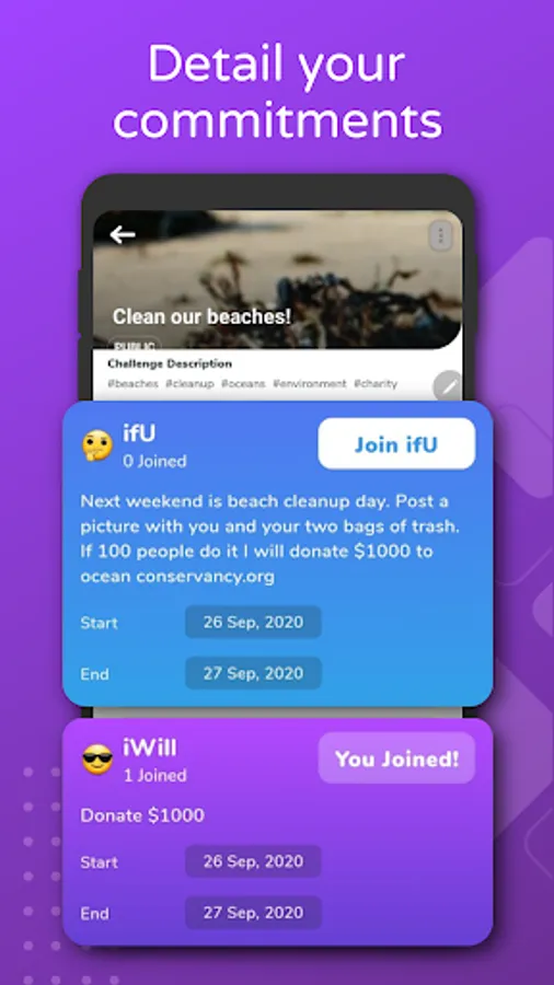 Whether you are looking for a partner to help you reach a fitness goal, looking to activate a community for your cause, or just play with others, ifUiWill will help you keep track of your commitments and find people who share your goals, interests, and sense of accomplishment.