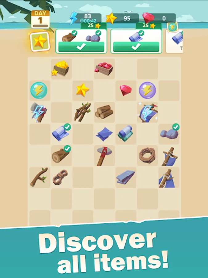 The resource is the most important thing once stranded, merge and provide items for Robin to upgrade his shelter and tools. With your help, there could be a house or a hut, or even a farm!