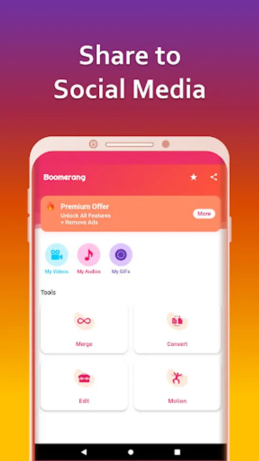Find something (or someone!) that's moving, or create a video selfie by switching to the front-facing camera. Boomerang for Instagram is an app that helps you edit videos in a professional way to live editor simple and intuitive. also a collection of the most popular editing tools and video converter. Turn any video into Boomerang and share to Social Media on Facebook or Instagram right from the app, or save your video to your camera roll to share later.