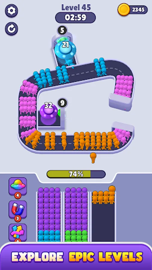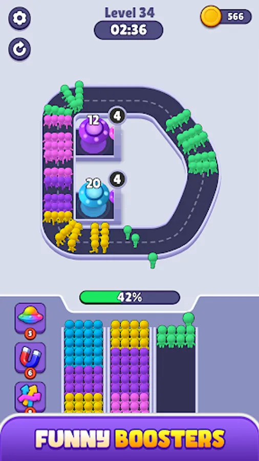 In People Jam, characters appear from lanes at the bottom. Tap and hold to send them onto the runway, then watch people jam get beamed up by matching UFOs. Complete all UFOs and experience the satisfying color jam puzzle flow. Plan your moves, time your taps, and enjoy endless people jam challenges in a relaxing puzzle flow.