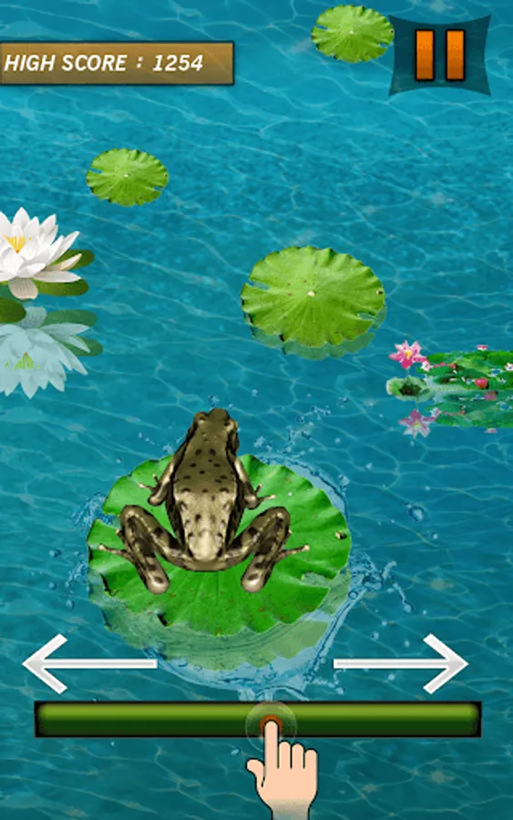 Swipe left/right for moving the frog horizontally, the frog is jumping from one floating leaf on water to the other leaf, never let your frog to fall into the water. Its a mind game for controlling your senses while playing this super awesome frog jumping mania game.