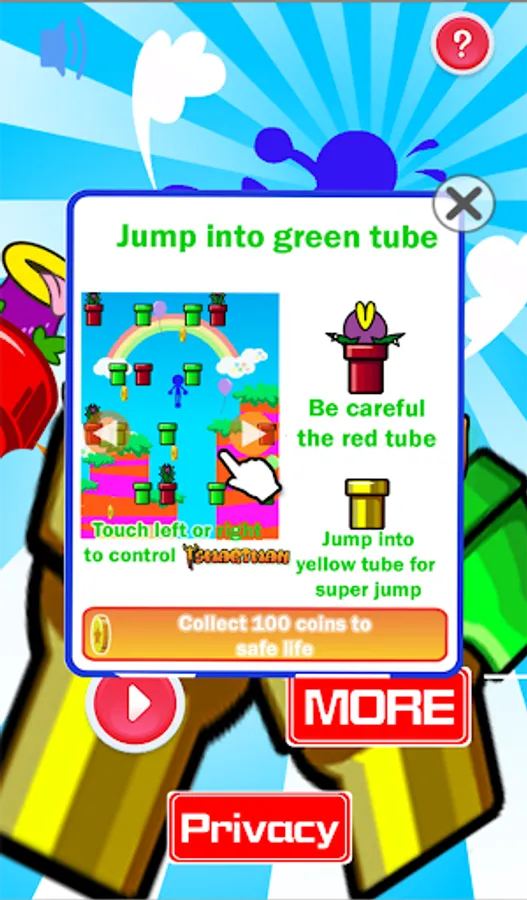 100 coins for 1 life. Smart man jumps. There are three types of red tube