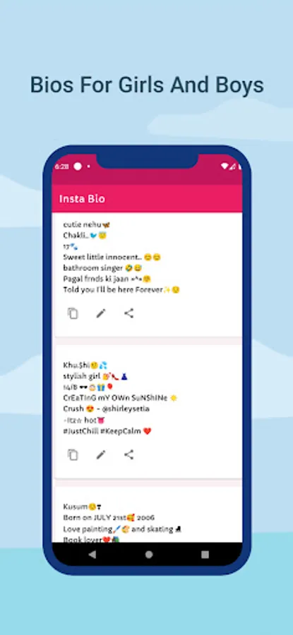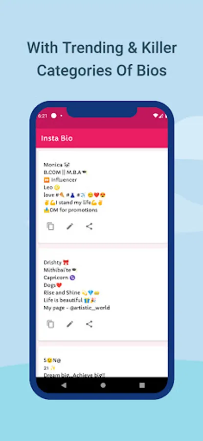 Considering the newest trends and user’s demand, we’ve developed a simple to use the app with the best feature that may show you popular bio and show you Profile Preview. if you want to captivate people to follow you on then Cool Bio App will defintely help you find the best bio ideas which is suitable for your profile. Best Bio will make someone decide whether they should follow you or not. It doesn’t matter if you have coolest ever pictures in your account but if your bio for is not good than your profile visitor might only scroll down your pictures and hit back button.