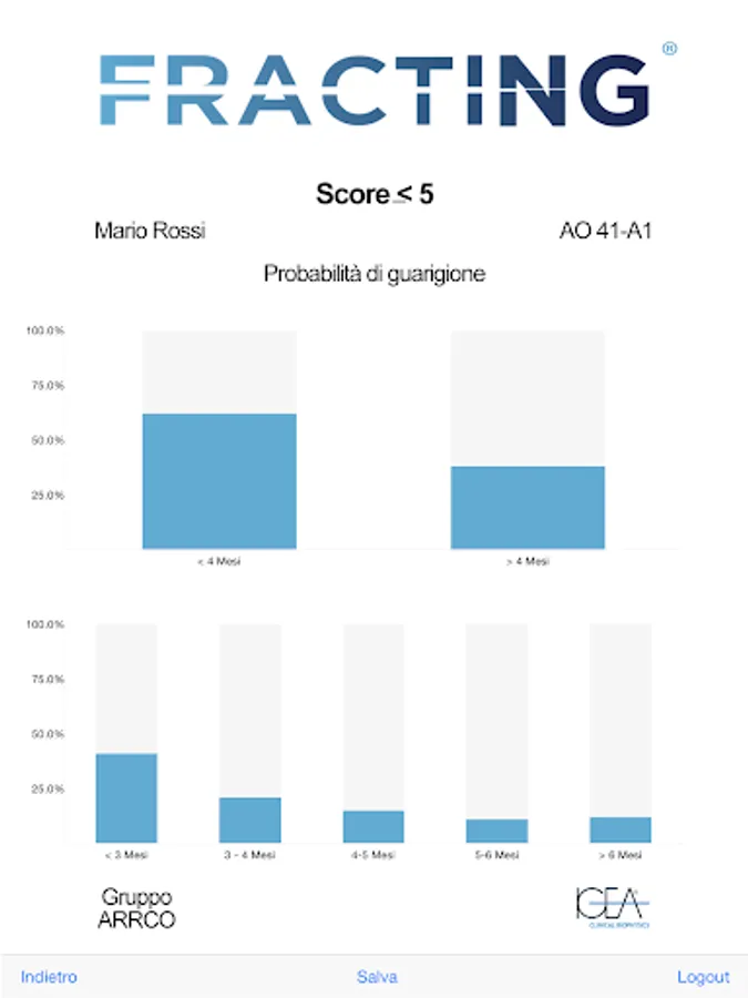 Fracting provides a "score" closely related to the time of healing, "Fracting Score". For each score is given two pieces of information: the probability of recovery of the patient within the first 4 months and the chance of recovery is divided into five time slots at intervals of one month each.