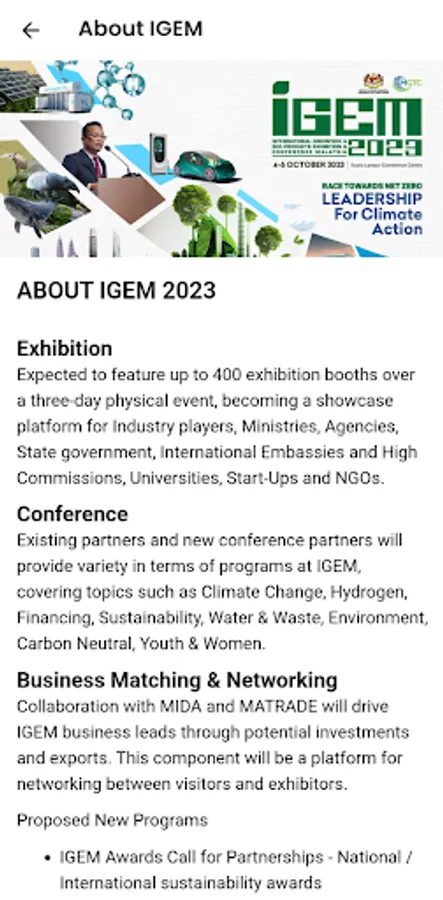 IGEM is an ideal platform for solution providers and green energy businesses to tap into the fast- expanding ASEAN market by showcasing the latest innovations to policy makers, government organizations, investors and public.