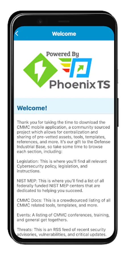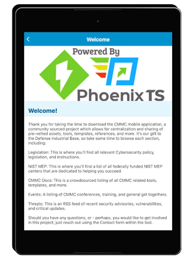 Struggling to keep up with cybersecurity compliance regulations? This app is intended for people who are interested in understanding the complexity of cybersecurity legislation, the Cybersecurity Maturity Model Certification (CMMC), and compliance in an easy to follow way! Powered by Phoenix TS