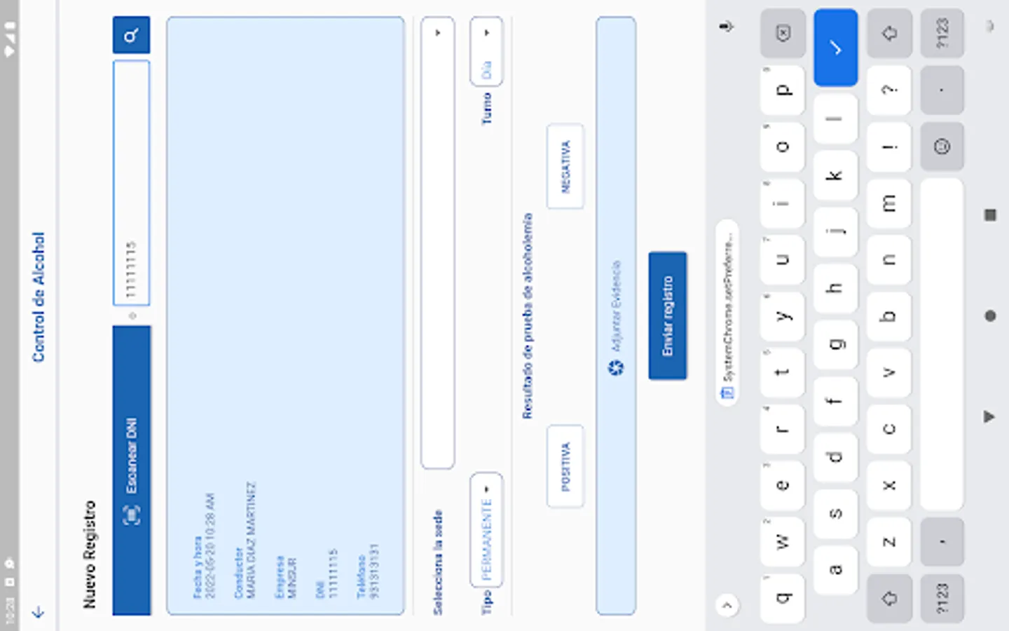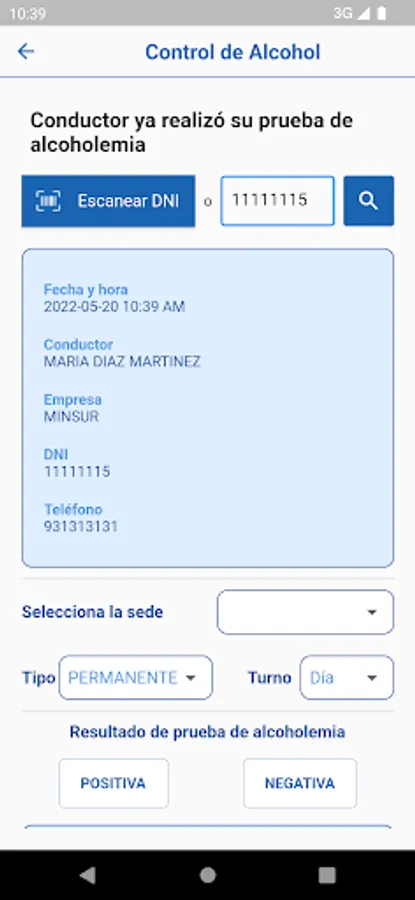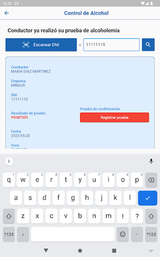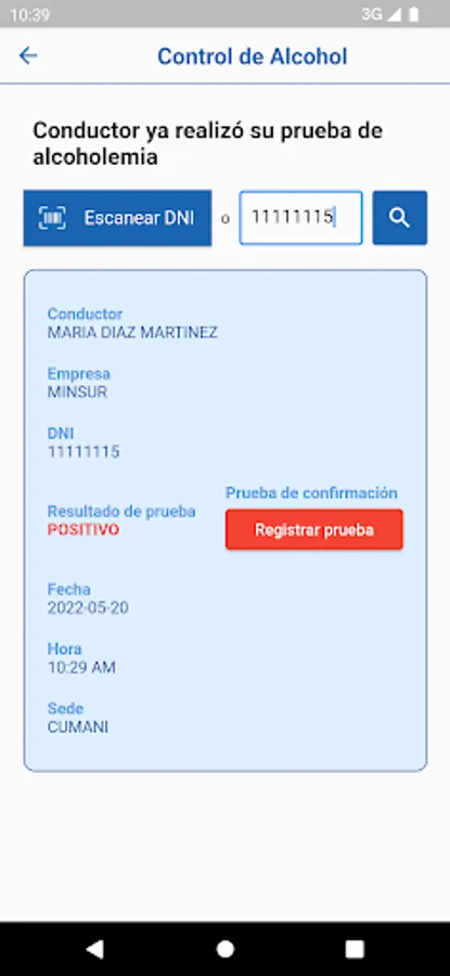 Application for the control of alcohol tests on drivers in the San Rafael Mine - Minsur.