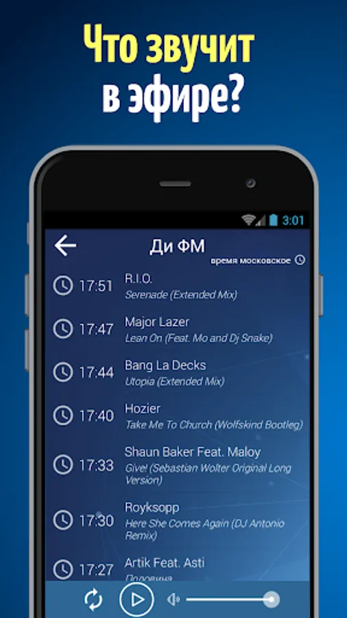 What's on air right now? What was on radio dfm? What song was playing on the radio? These questions will be answered by the Radio Playlist section. Put the radio Like! We have FM radio of Russia and Europe, Radio of Moscow and St. Petersburg in full plus more than 100 stations with playlists, this is an online radio record!