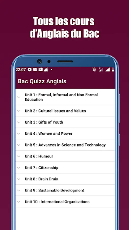 This application offers you courses and exams in the form of Quiz, which will help you to assess your knowledge and to revise for the Bac 2020.