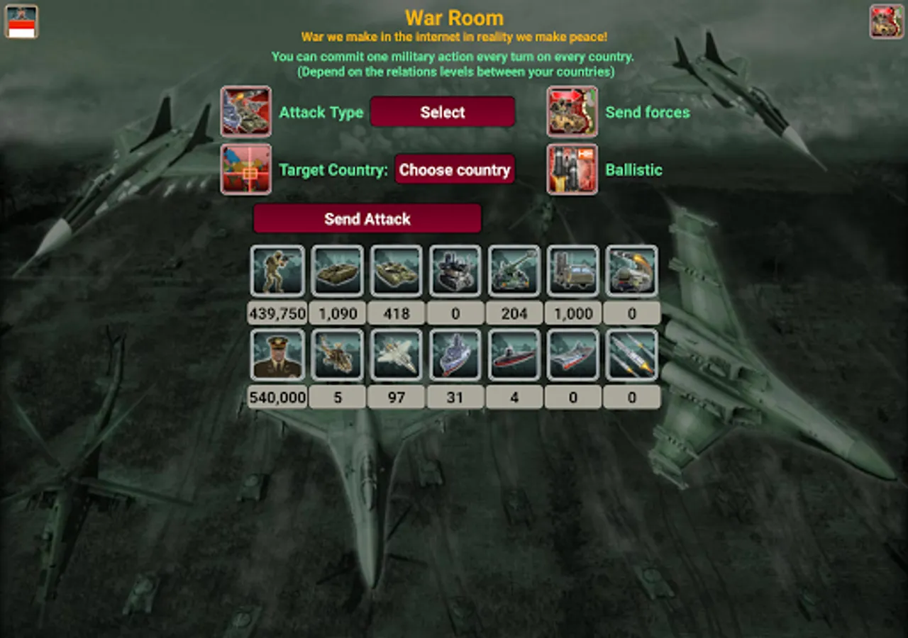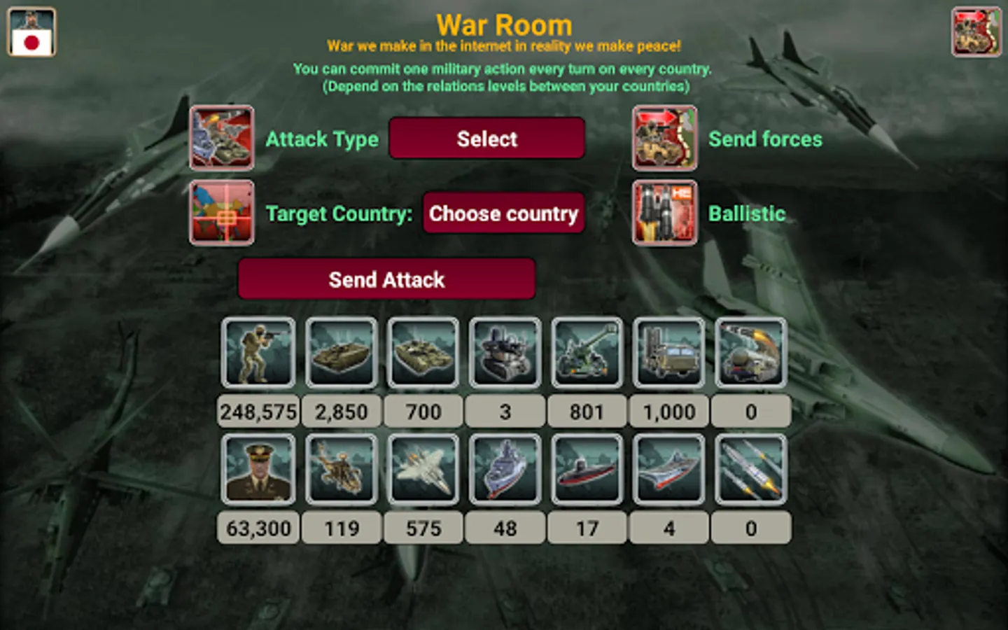 Select your country you wish to lead (50 countries available!) and play against the smart AI enemies. With excellent leadership skills, strategy and tactics, you could lead your country to the win.
