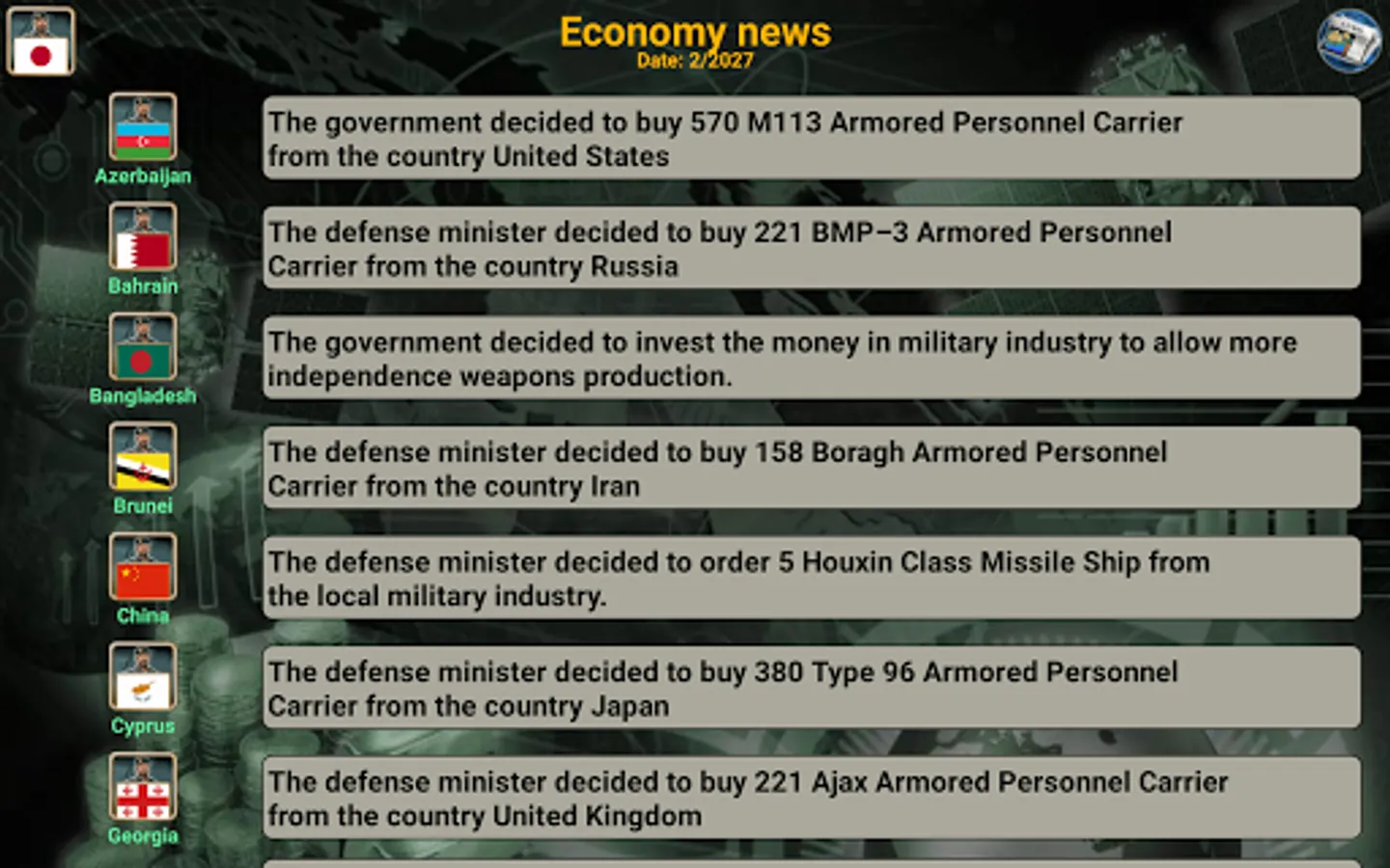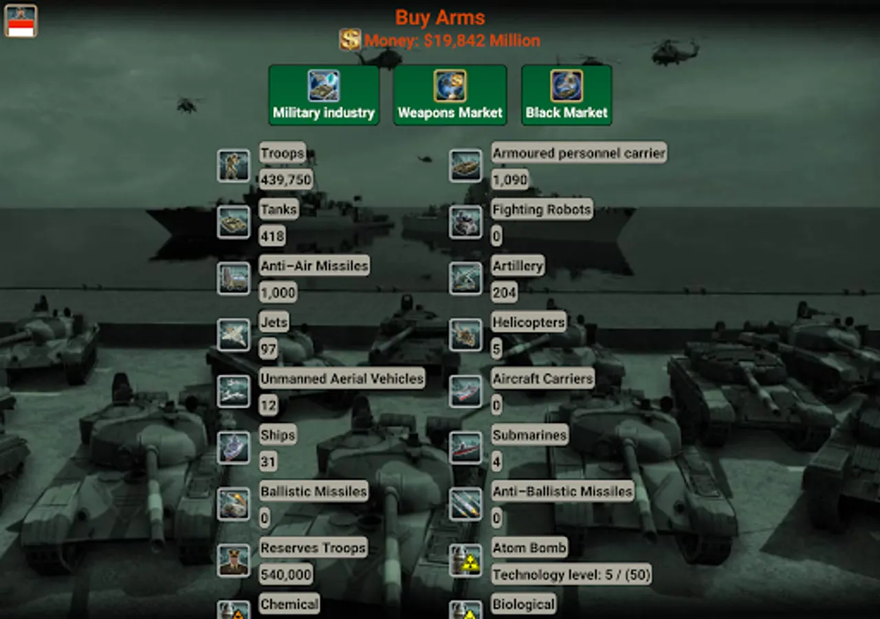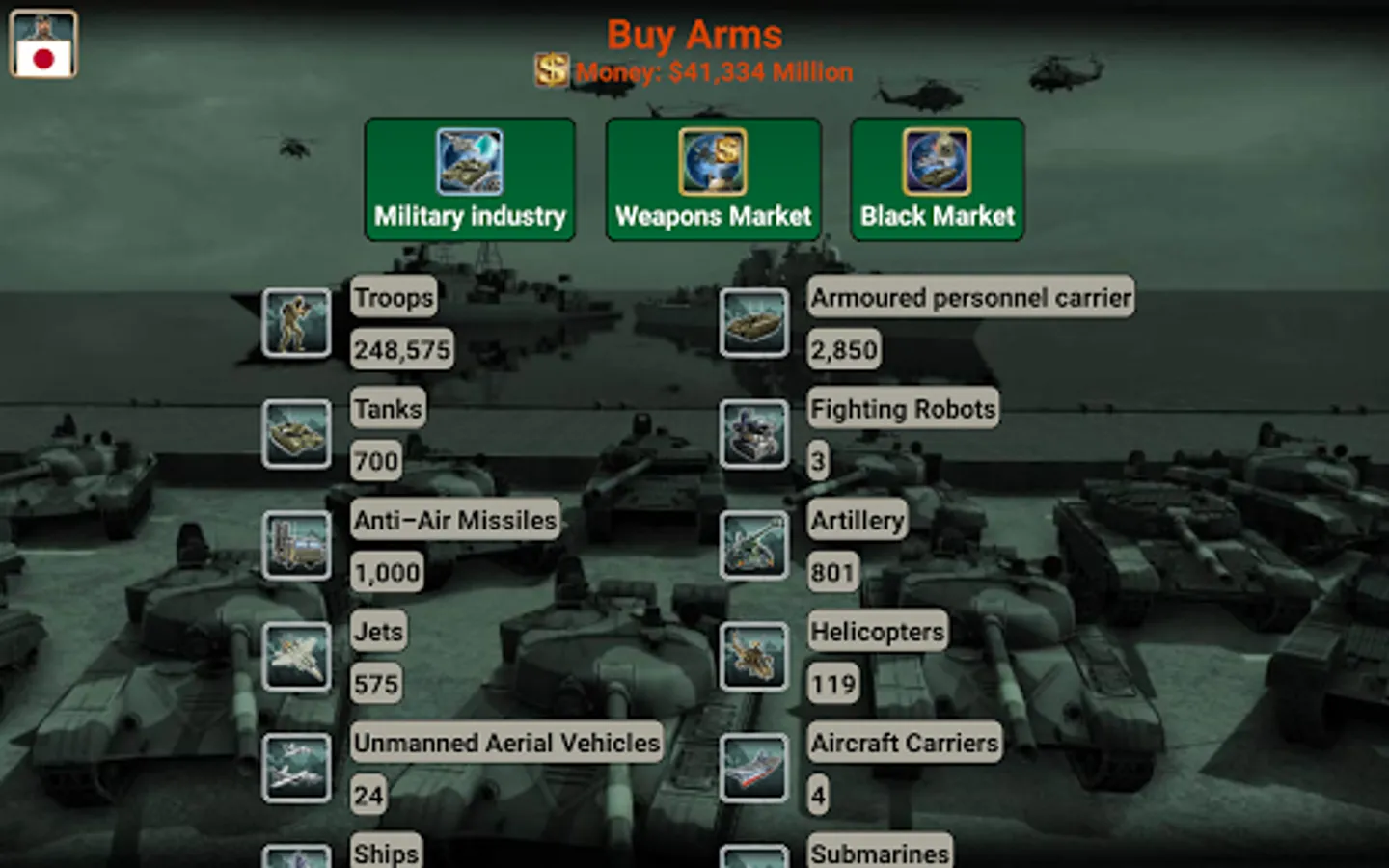 Mercenaries, Armored personnel carrier (APC's), Tanks, Artillery, Anti-Air Missiles, Helicopters, Fighter Jets, Ships, Submarines, Fighting Robots, Unmanned Aerial Vehicles (UAV's), Aircraft Carriers and Ballistic missiles.