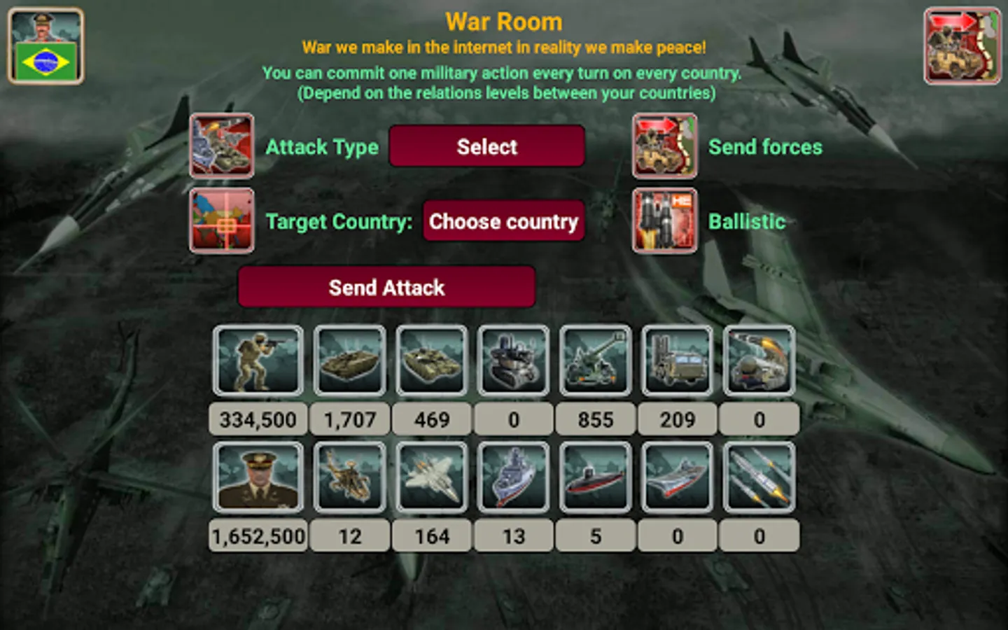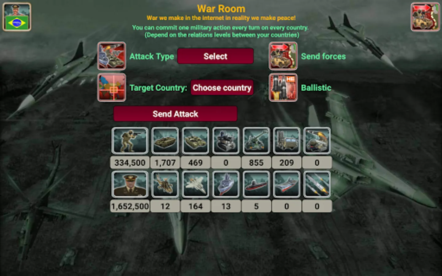 Select your country you wish to lead and play against the smart AI enemies. With excellent leadership skills, strategy and tactics, you could lead your country to the win.