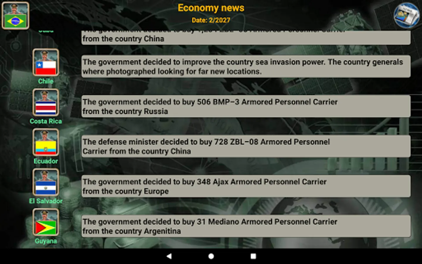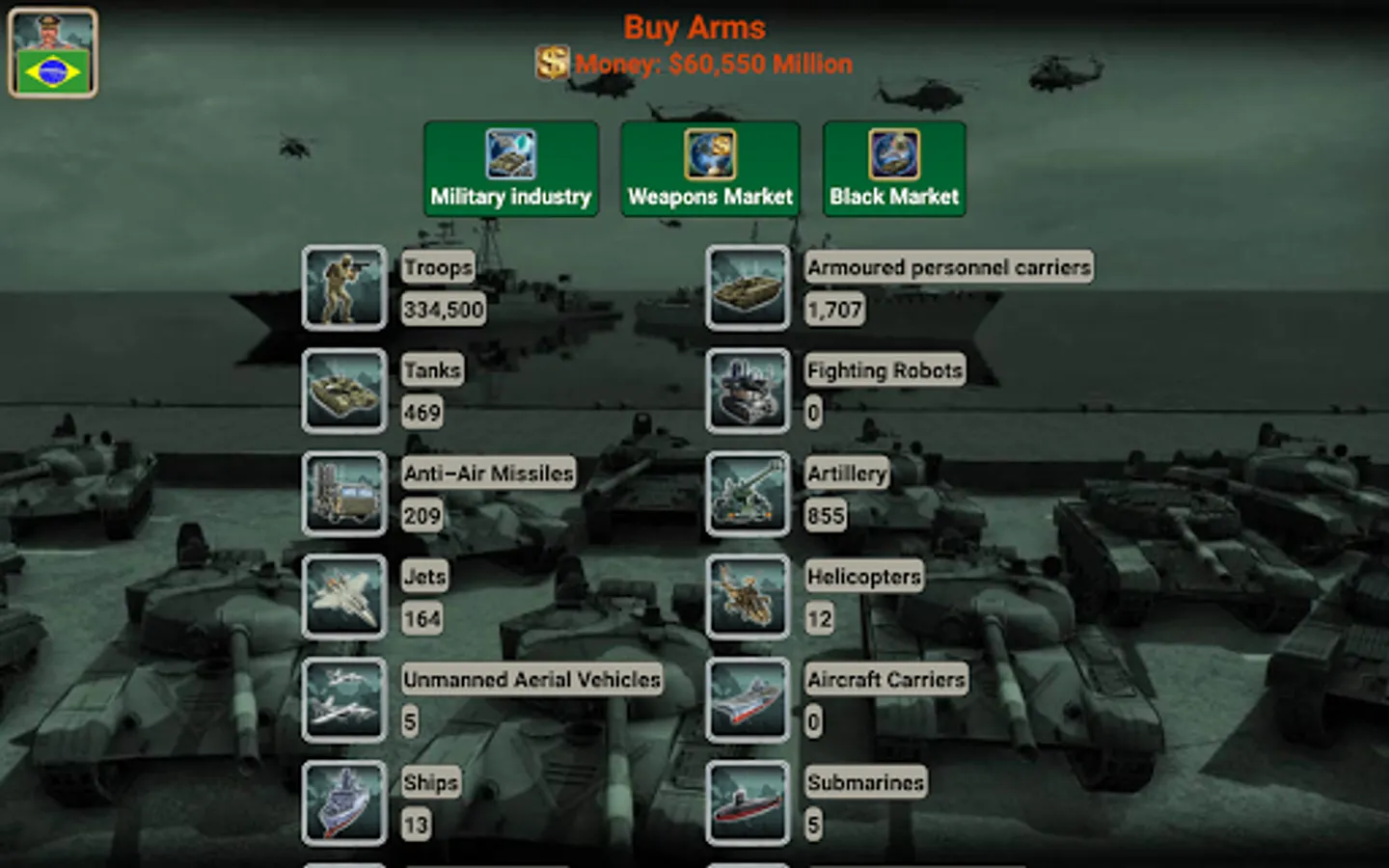 Mercenaries, Armored personnel carrier (APC's), Tanks, Artillery, Anti-Air Missiles, Helicopters, Fighter Jets, Ships, Submarines, Fighting Robots, Unmanned Aerial Vehicles (UAV's), Aircraft Carriers and Ballistic missiles.