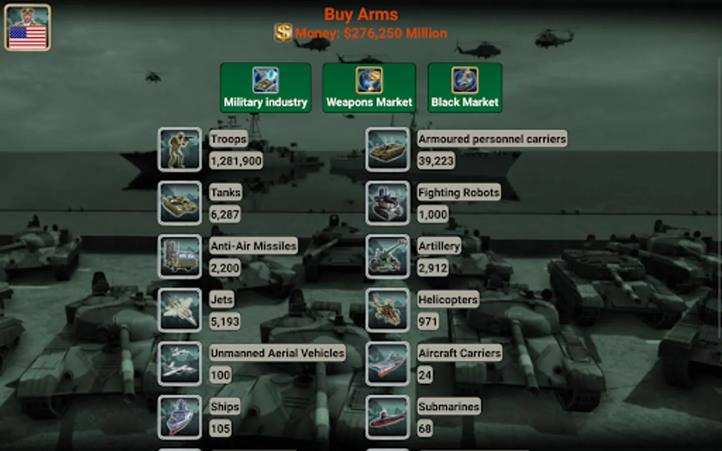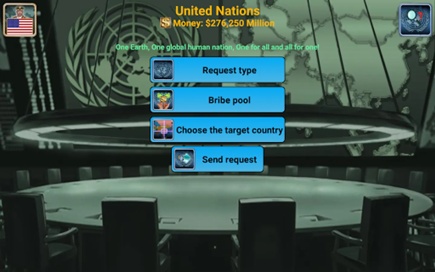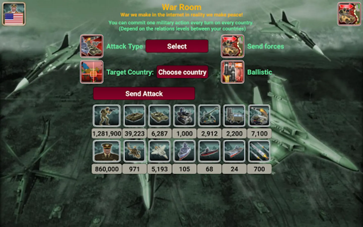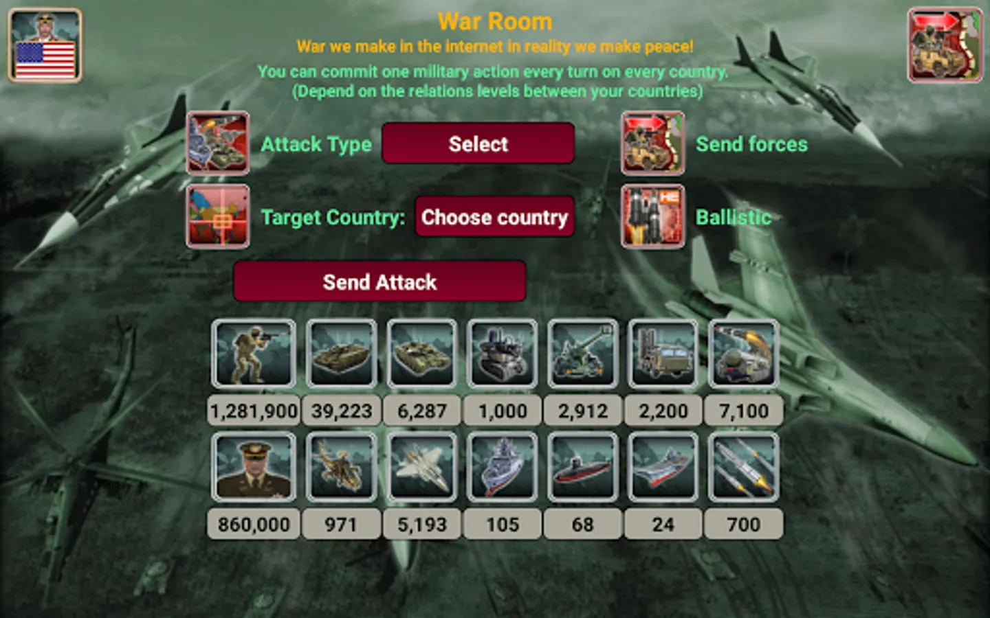 The game offers a wide range of features, including access to global Weapons Suppliers, a Spy Center, a War Room, Diplomats, the United Nations, an Economy system, Technology, and World News Distribution (Economy, Relations, Spy, and War). All this is powered by advanced Artificial Intelligence.
