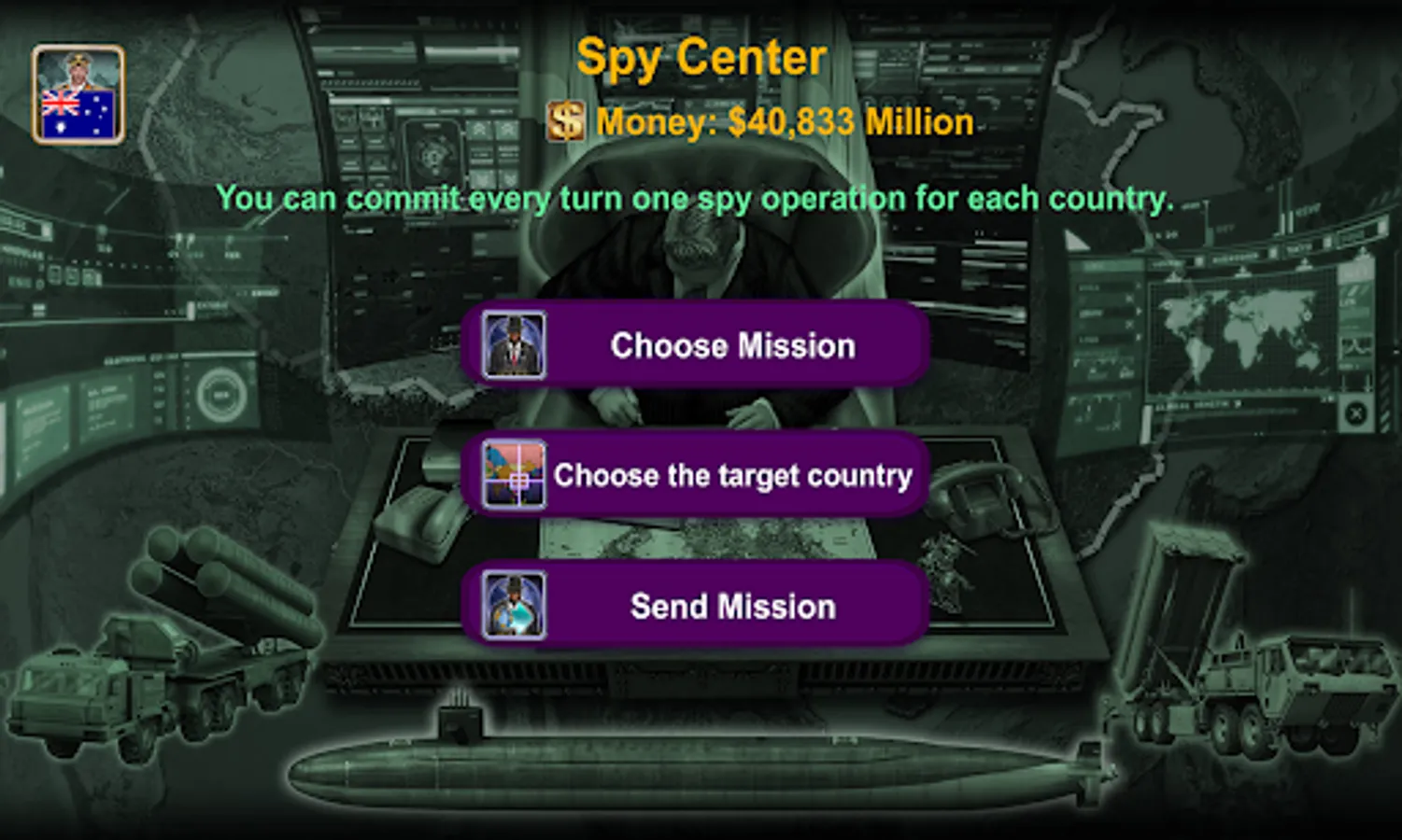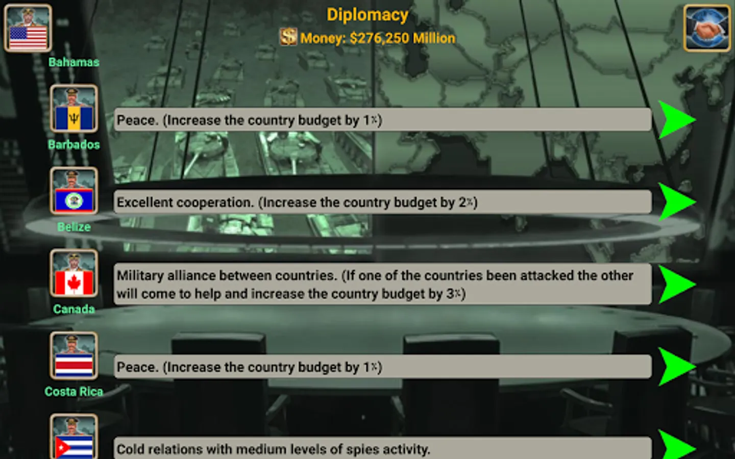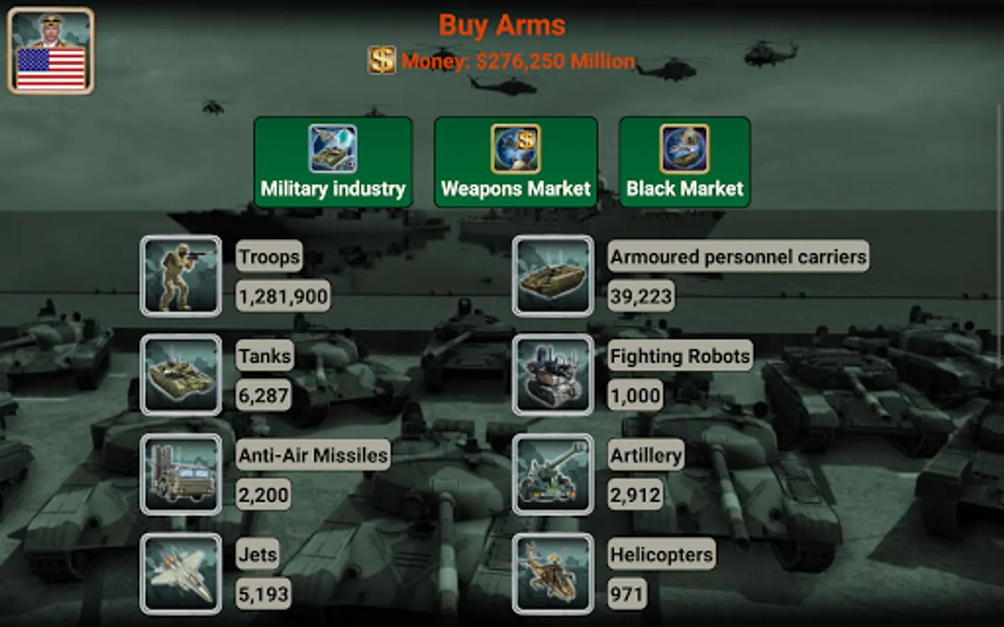 The game offers a wide range of features, including access to global Weapons Suppliers, a Spy Center, a War Room, Diplomats, the United Nations, an Economy system, Technology, and World News Distribution (Economy, Relations, Spy, and War). All this is powered by advanced Artificial Intelligence.