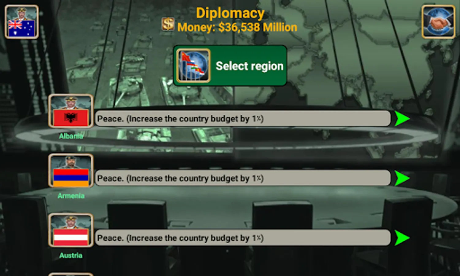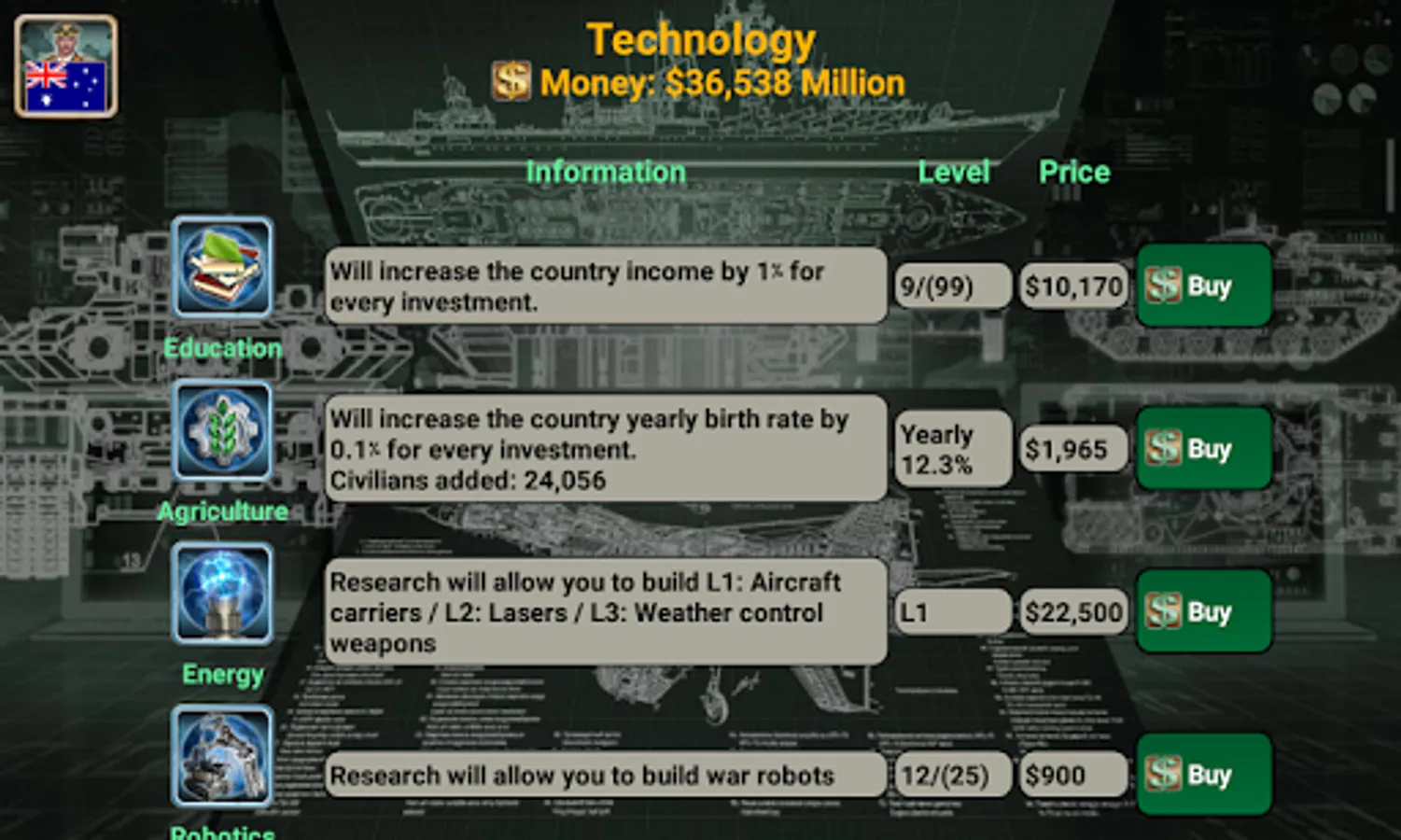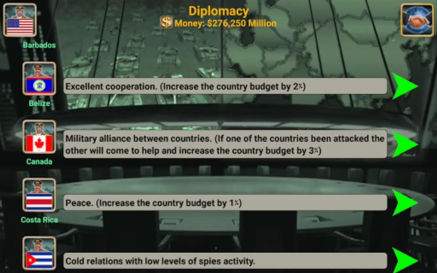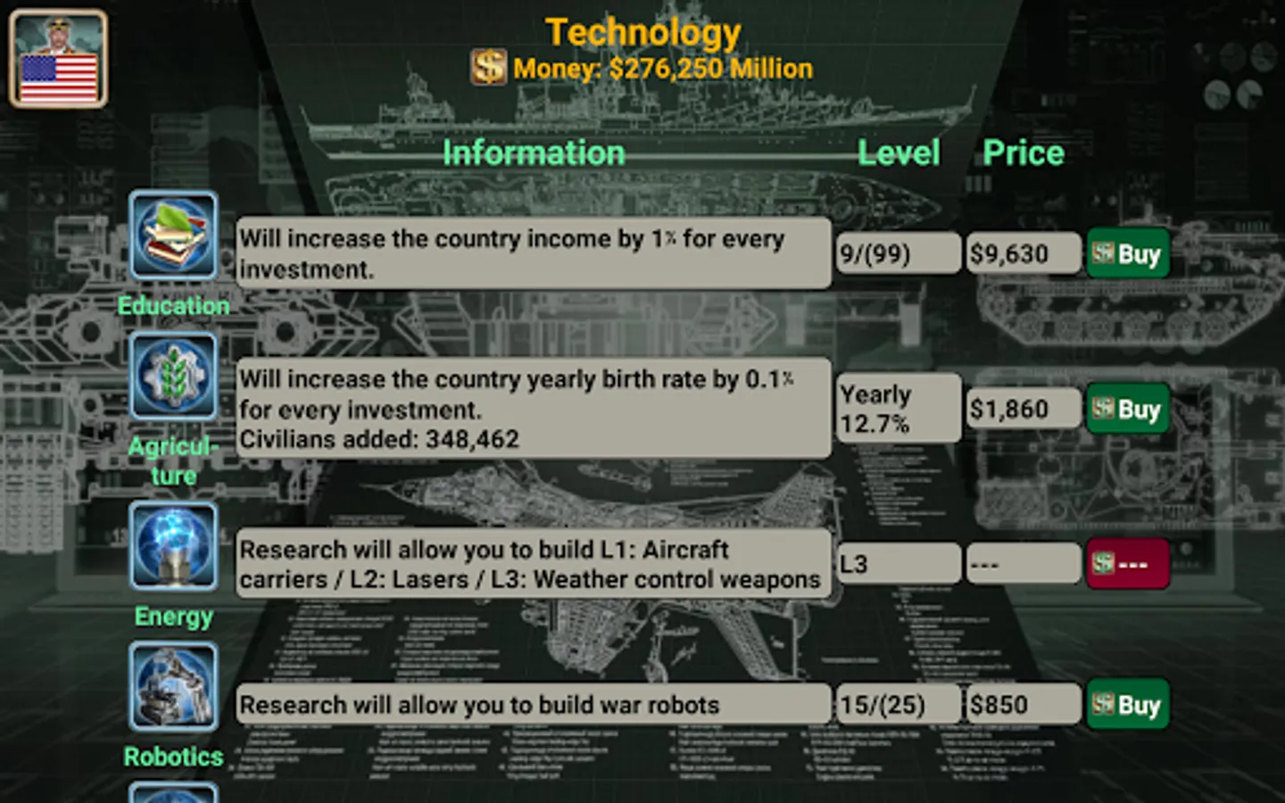 The game offers a wide range of features, including access to global Weapons Suppliers, a Spy Center, a War Room, Diplomats, the United Nations, an Economy system, Technology, and World News Distribution (Economy, Relations, Spy, and War). All this is powered by advanced Artificial Intelligence.