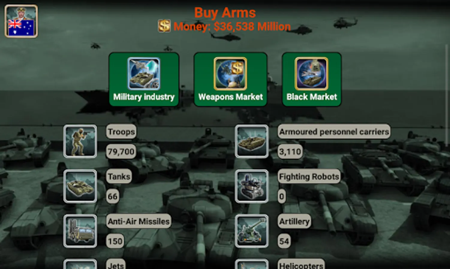 Arm yourself with an arsenal of weaponry, including Mercenaries, Armored Personnel Carriers (APCs), Tanks, Artillery, Anti-Air Missiles, Helicopters, Fighter Jets, Ships, Submarines, Fighting Robots, Unmanned Aerial Vehicles (UAVs), Aircraft Carriers, and Ballistic missiles.