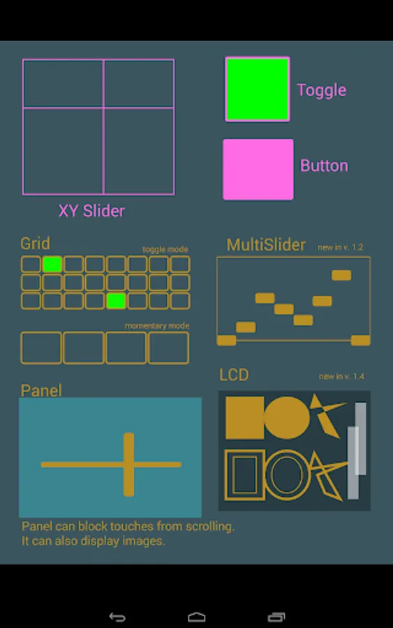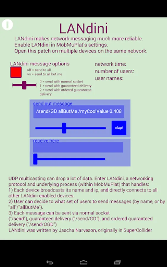 MobMuPlat hosts a list of user-created documents, each of which defines a user interface and audio engine. MobMuPlat can do synthesis, sampling, networking via local wifi, OSC messaging, set and query hardware characteristics, use device sensors, use MIDI and HID devices, display images/graphics, and much more.
