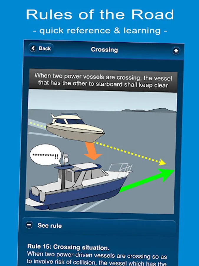 This boating, sailing and marine nautical app provides all skippers and crew with the essential quick reference knowledge they need to quickly interpret what other vessels are doing, who has right of way and what action they should take to prevent a possible collision, as specified by the IRPCS ColRegs Rule of The Road "Steering and Sailing Rules", and "Sound and Light Signals" sections.