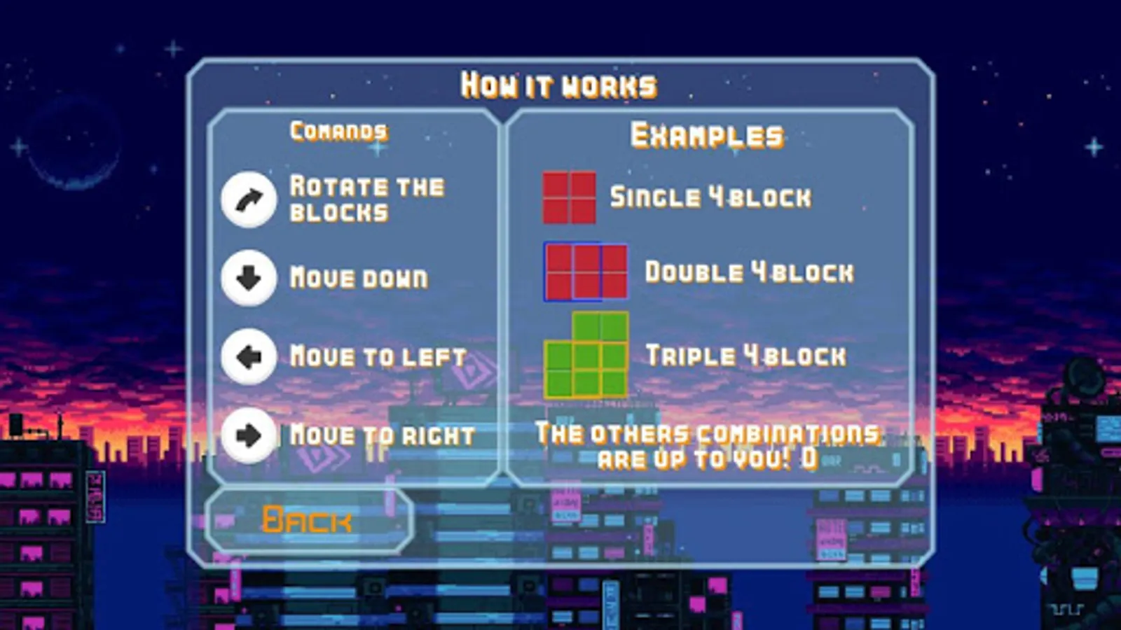 In this game you'll have to drop in the playable grid 2x2 squares made of random colors, and you must be albe to build 2x2 squares of the same colors to destroy them!