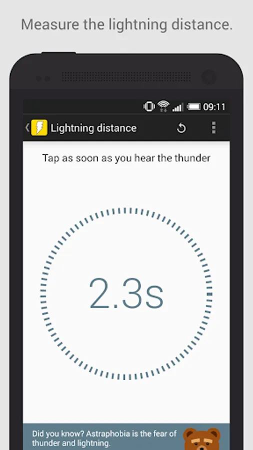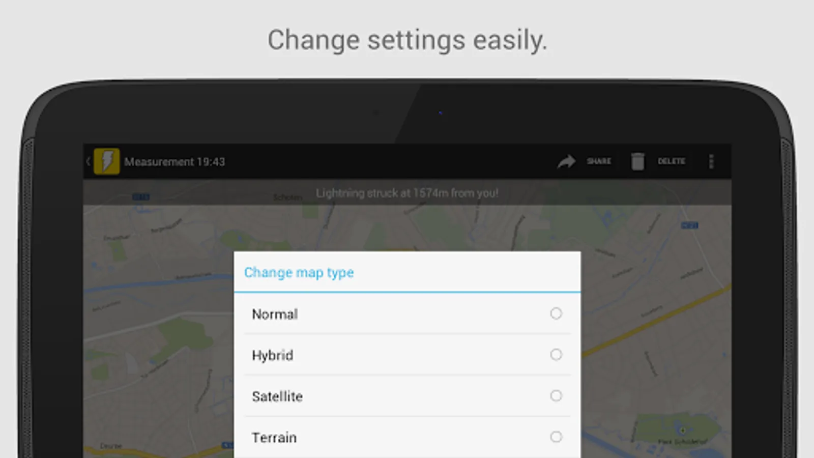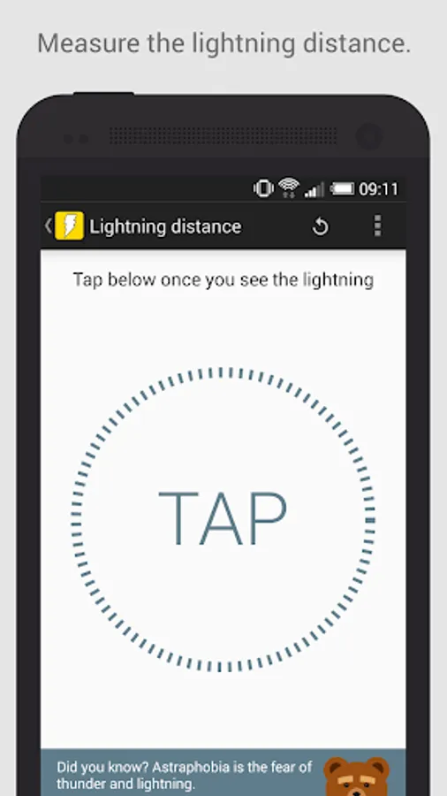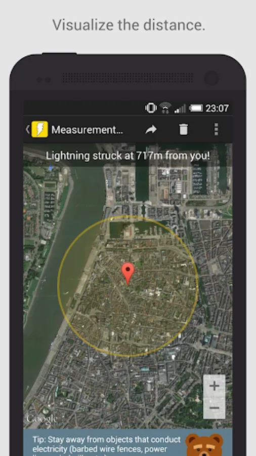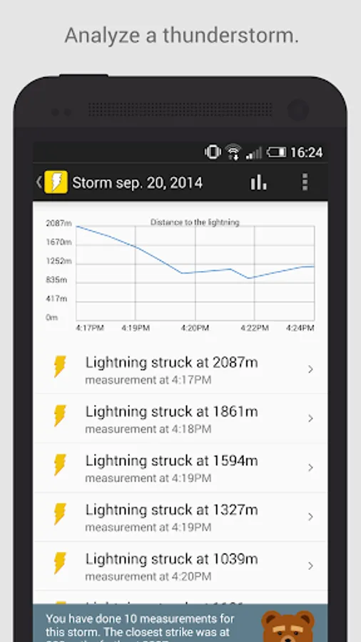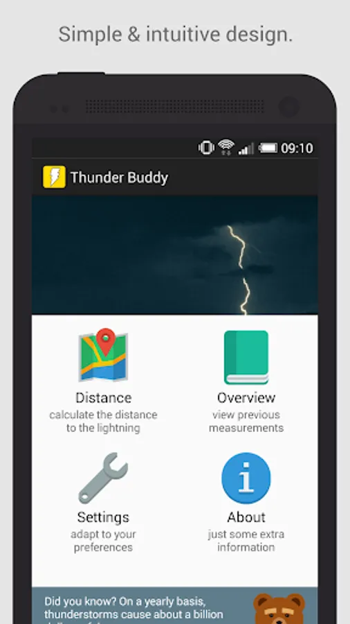 Find out the lightning distance within a few taps using Thunder Buddy! You can view the thunderstorm's estimated location on Google Maps. Keep track of all the thunderstorms you ever survived, wherever whenever, in a clean history overview. And last but not least, read interesting facts about thunder & lightning.