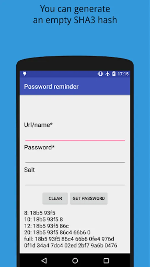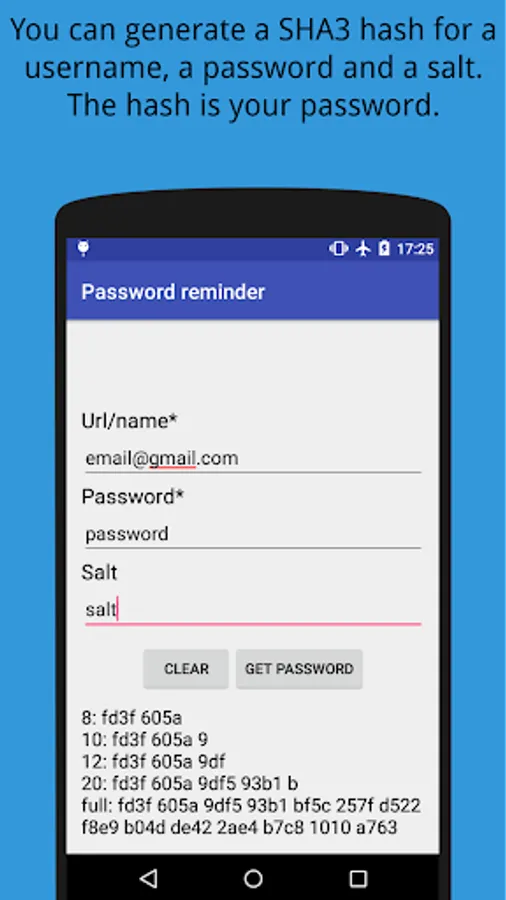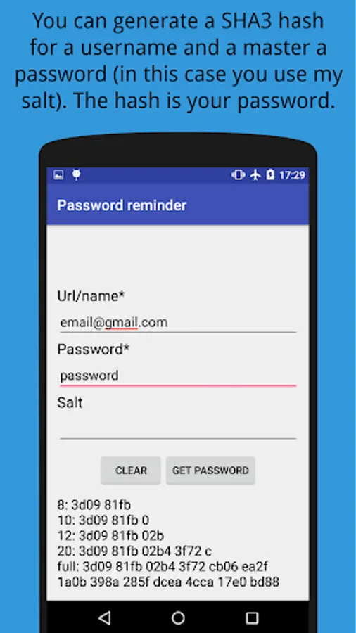 The app does not store any passwords. It generates hash SHA3 (256) passwords for any website/name with an unique master password and salt. If you leave salt field empty the app will use default salt.