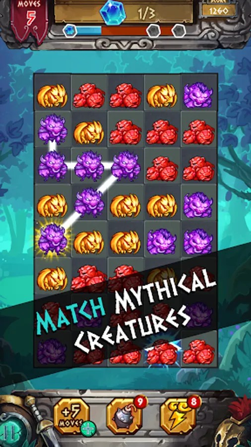 Connect and combine colored creatures in this mythical puzzle adventure to progress to the next level.