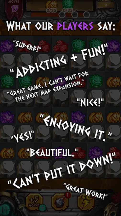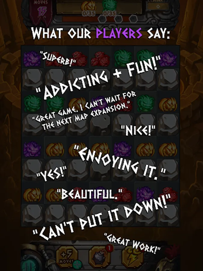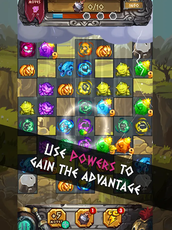 ● Powerful lightning bolts, powder packed ancient bombs, volatile creatures, and various other fabled power-ups to help with challenging levels