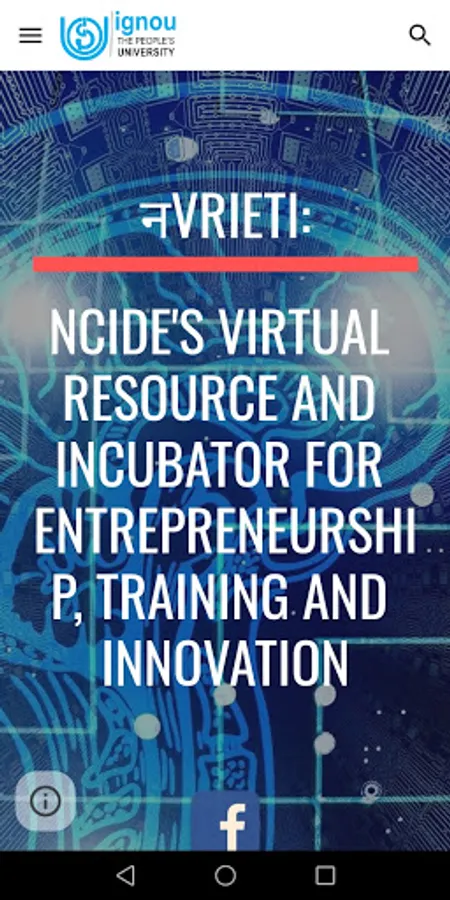 In order to promote, support, and nurture the students interested in innovation and entrepreneurship, NCIDE has designed and developed a virtual incubator named नVRIETI: NCIDE's Virtual Resource and Incubator for Entrepreneurship, Training, and Innovation. It is a one-stop portal for IGNOU students who are interested in innovation, startups, and entrepreneurship.