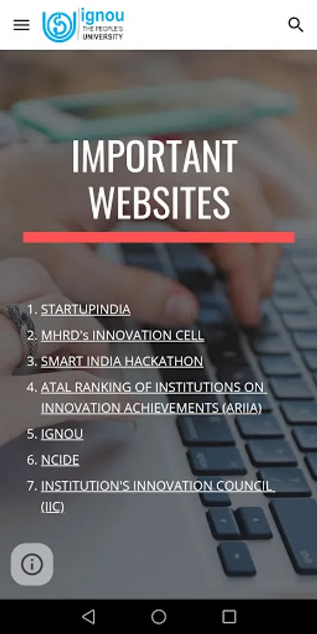 It has sections like IGNOU schemes, Resources, Inspiring Stories, Events/Workshops, and Important Websites. The section on IGNOU schemes highlights the various schemes of IGNOU for its learners related to innovation, startups, and entrepreneurship. The resources section has links to a few online courses and Learning Resources of NCIDE. Inspiring stories highlight stories of successful entrepreneurs. The Events/Workshop page highlights the latest events organized by NCIDE, IIC, etc.