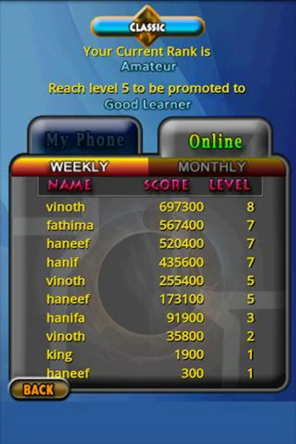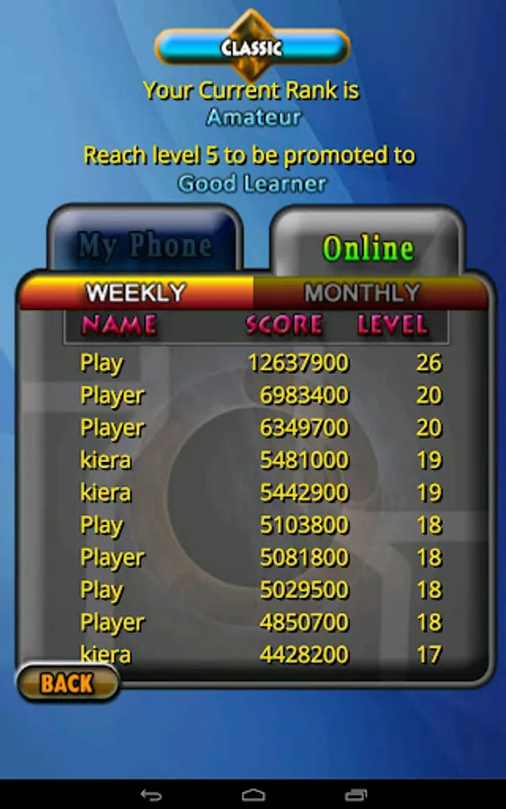 All game modes have individual player ranking system based on the highest level/Score achieved. Players are ranked in five categories from Amateur to Legendary. Your rank naturally improves along with your skill as you play again and again, thats what makes JewelMagic so addictive.