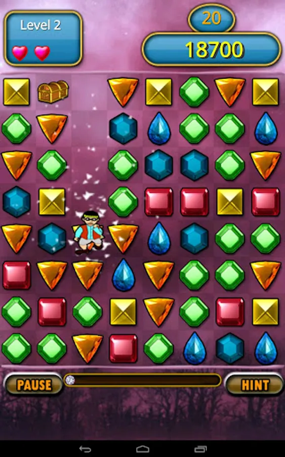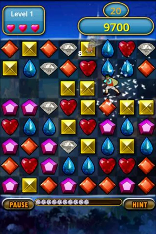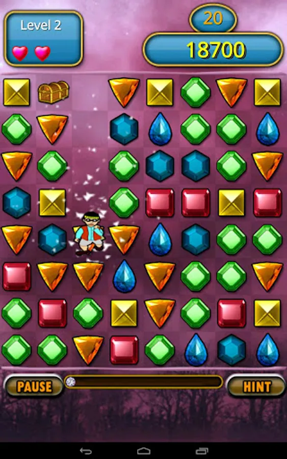 - Sackman clears all gems in a row or column by matching two similar gems adjacent to him.