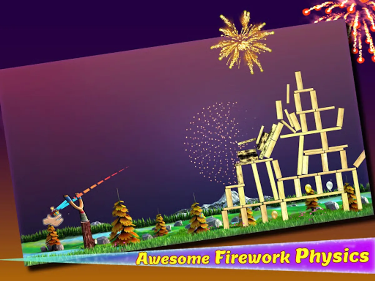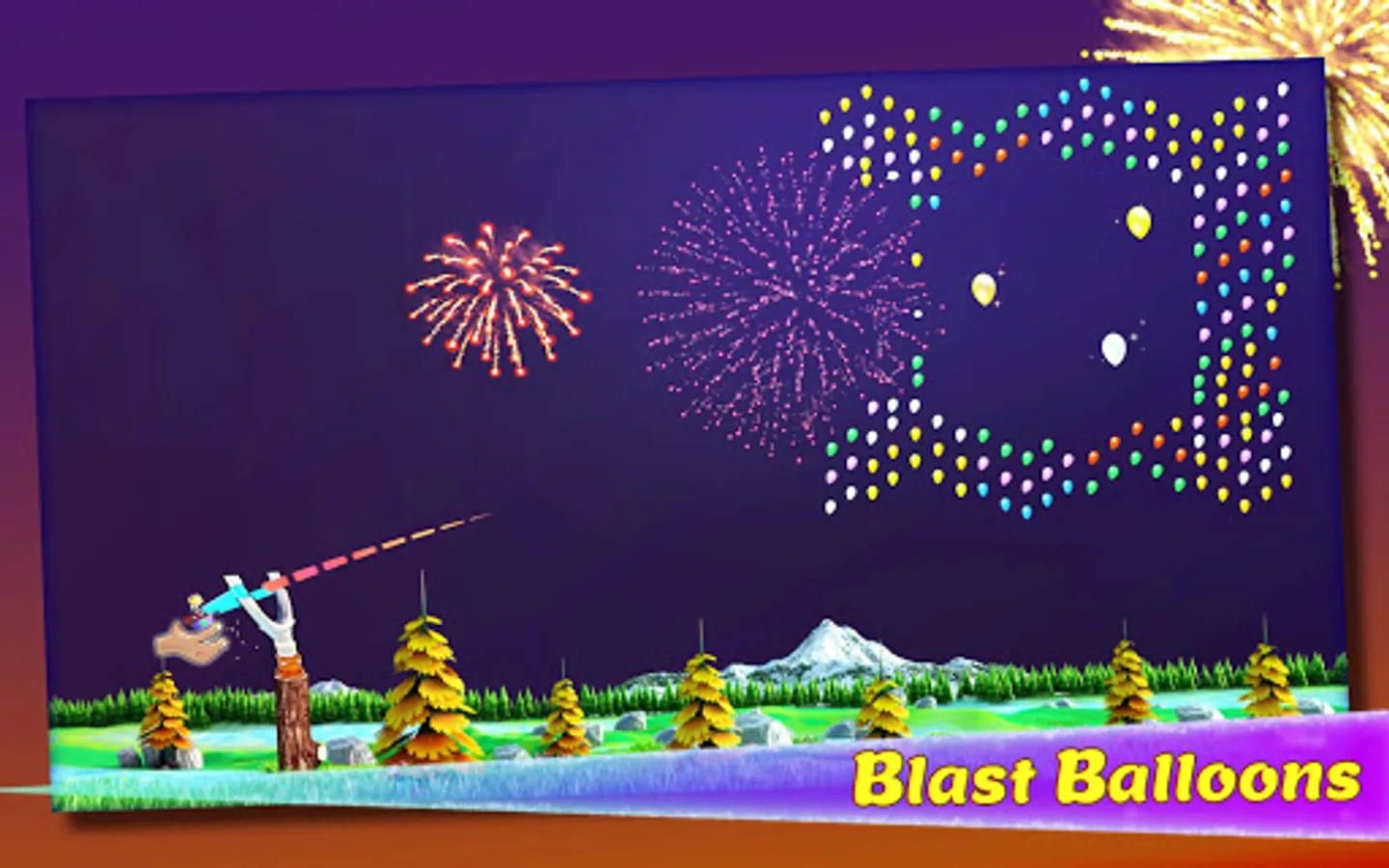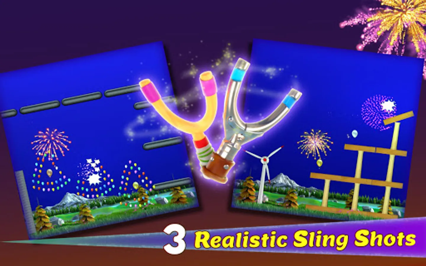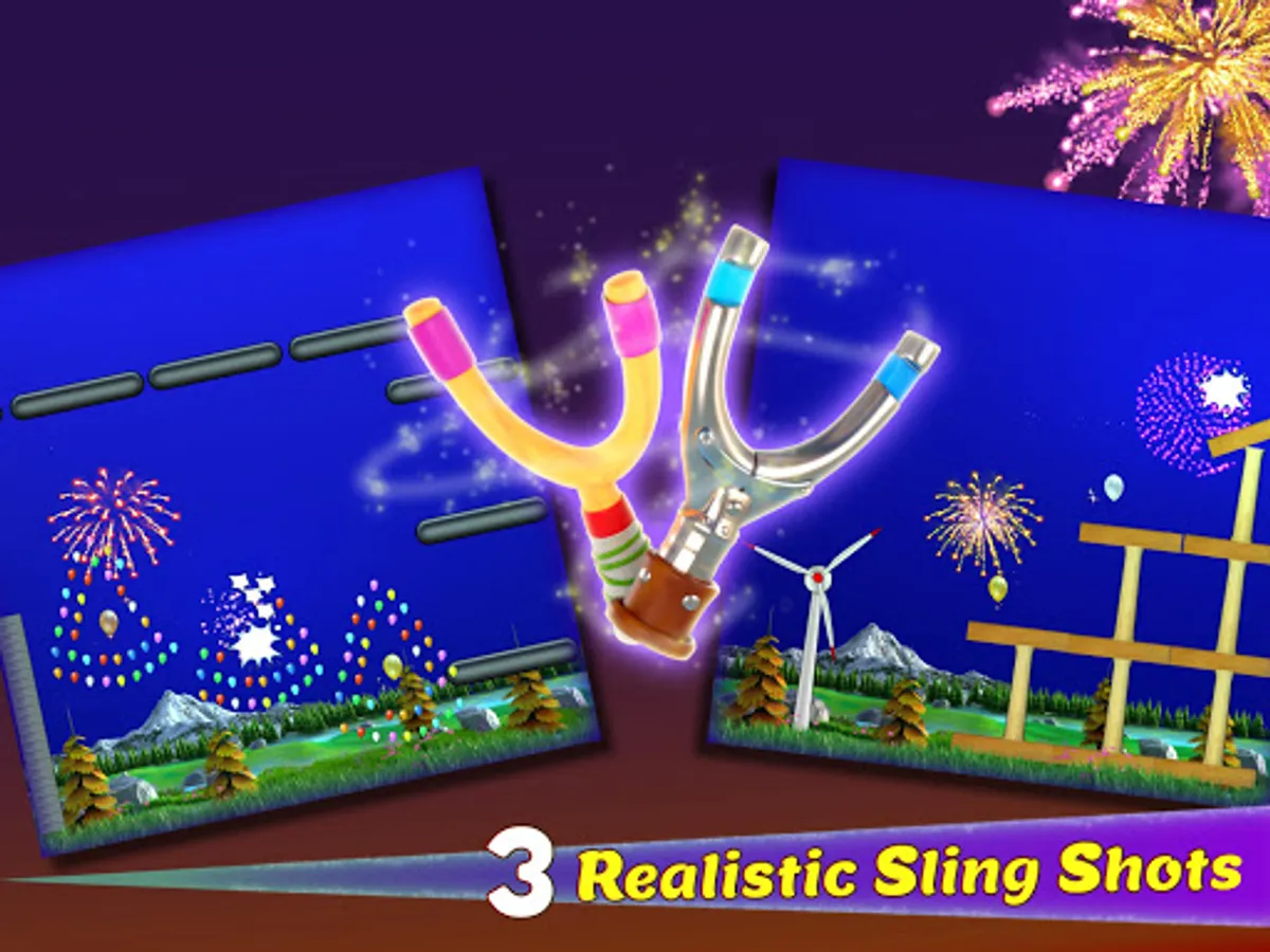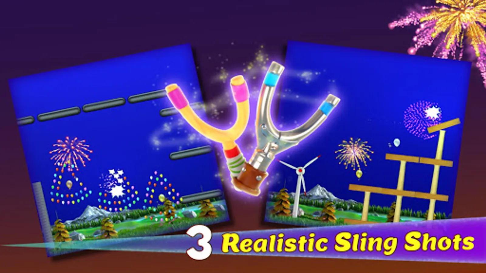 Slingshot fireworks to pop target gold, silver and bronze balloons in exciting simulated fantasy environments.